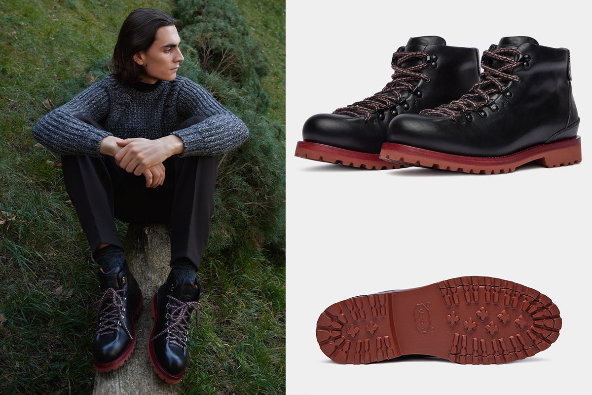 マウンテンシューズを、スタイリッシュに、タウンユースとしてアレンジされているが、ベジタブルタンニングの最高級フルグレインカーフレザーのアッパーに、メタル製ベルフック、履き口とシュータンに詰めたパッド、丸みを帯びたラスト、マッケイ製法で縫製したビブラム社製のスポンジソールは、長時間履いても快適で、軽やかな履き心地と絶妙なモード感を両立させた、使い勝手の良いモデルです。