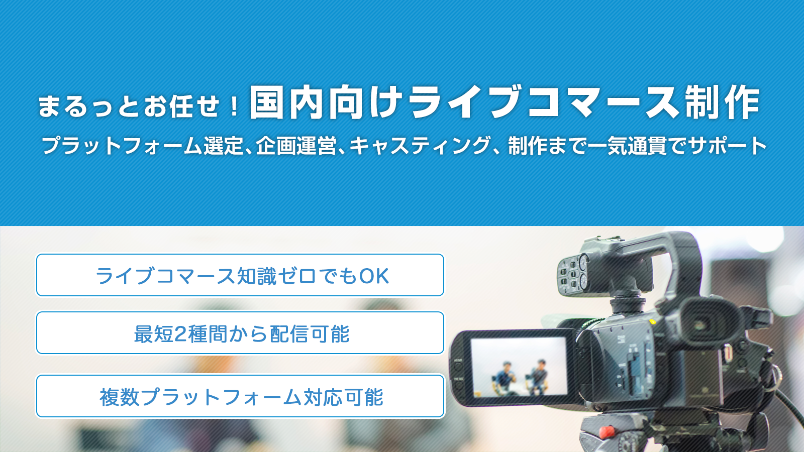 日本国内向けのライブコマースをまるごとサポートいたします。プラットフォームの選定から企画、キャスティング、制作まですべてお任せください。