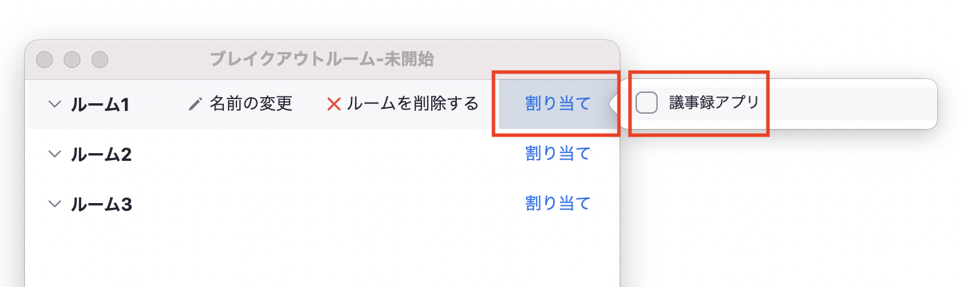 2.設置したいブレイクアウトルーム横にカーソルを合わせ「割り当て」部分でbotを選択