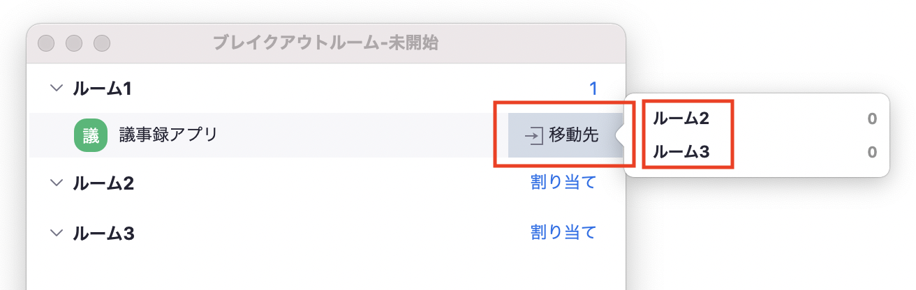 2.「移動先」にカーソルを合わせ、移動したいブレイクアウトルームを選択