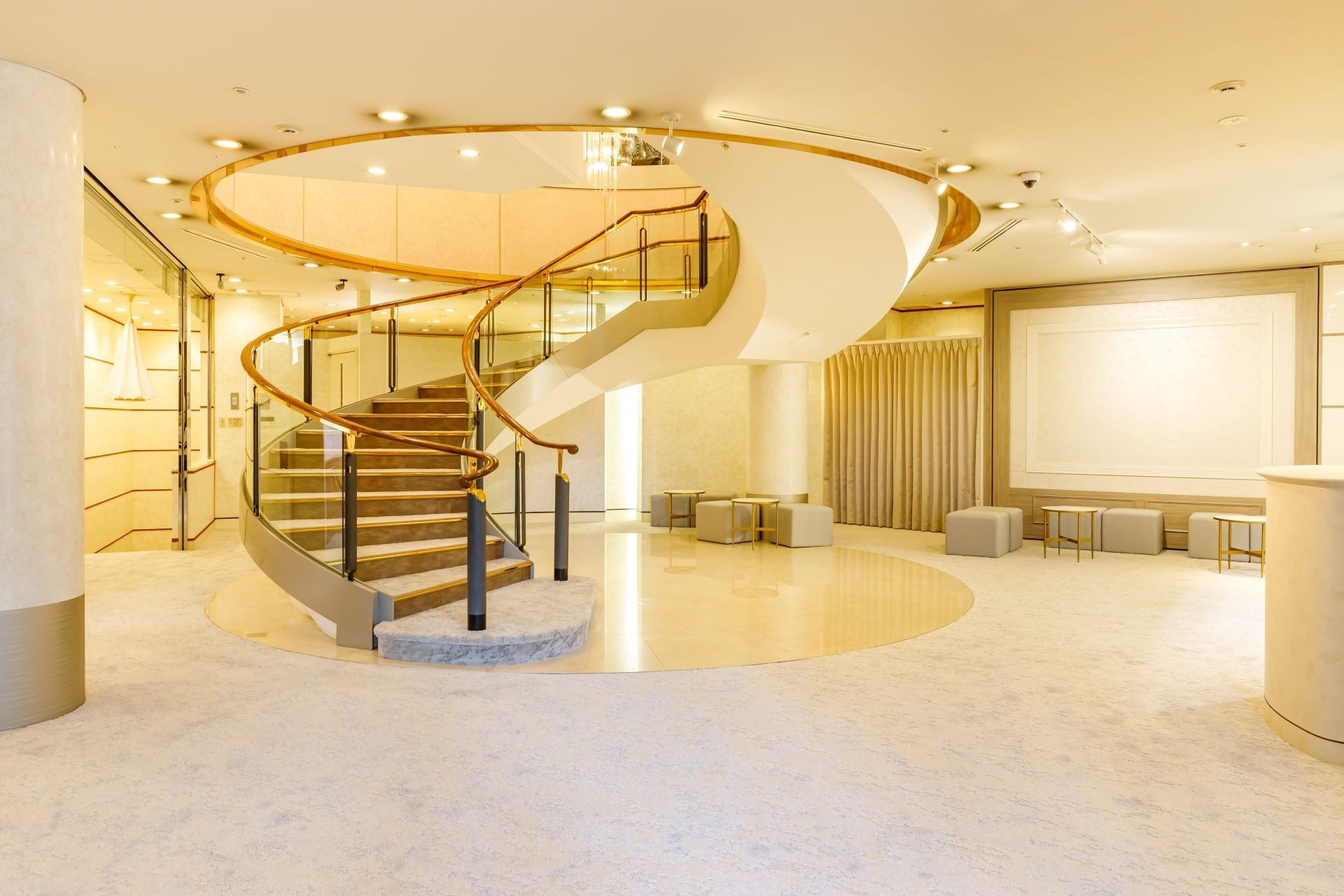 明治記念館は、明治14(1881)年に「⾚坂仮皇居の御会⾷所(⽇本初の迎賓館)」として竣工されました。本館の会場「金鶏(kinkei)」は、『⼤⽇本帝国憲法』草案審議の御前会議の場ともなり、現在でも憲法制定の由緒から『憲法記念館』と呼ばれています。昭和22(1947)年には結婚式場『明治記念館』として開館し、現在は迎賓施設として国内外問わず多くのゲストにご利用いただいています。令和2(2020)年に本館の歴史的・建築的価値が認められ、東京都指定有形⽂化財(建造物)に指定されました。明治天皇の宮廷外交の舞台となったダイニングホール(御会食所)は、平日は主にカフェ・ラウンジとしてご利用頂けます。