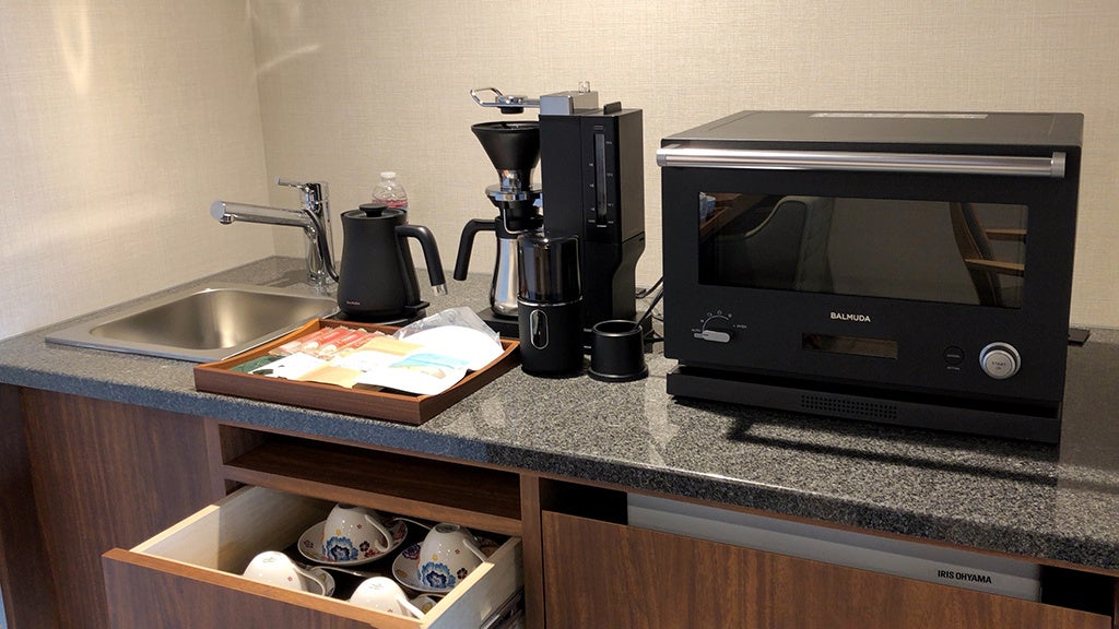 その他、長期滞在にもご利用いただける様に、レンジ、ポットをバルミューダシリーズにて手配する他、簡単な調理が可能なスタイリッシュなカウンターと、ちょっとした時間も有効に活用出来るようワーケーションスペースも新設いたしました。