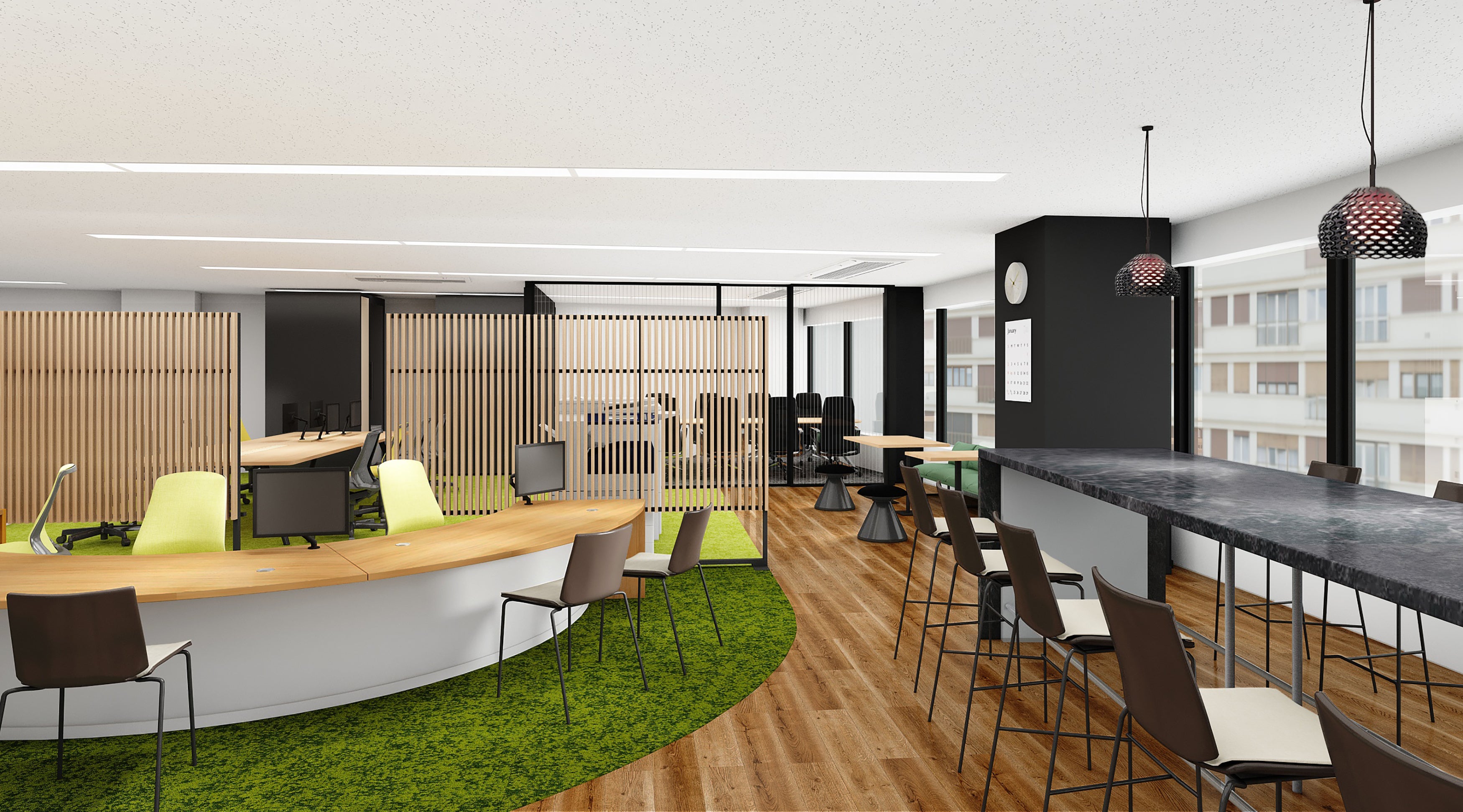 鳥たちが自由に行き来する「とまり木(パーチ)」をイメージしたフリーワークスペースを、お取引企業様やオーナー様もご利用いただける場所として解放します。加えて、博多駅を一望できる眺望を活かし、カフェサービスやバーカウンターを設置、お客様が出張等で遠方よりお越しになった際、新幹線や飛行機の出発時間まで仕事ができるなど、ラウンジのようにくつろいで過ごしていただける空間づくりが大きな特徴です。