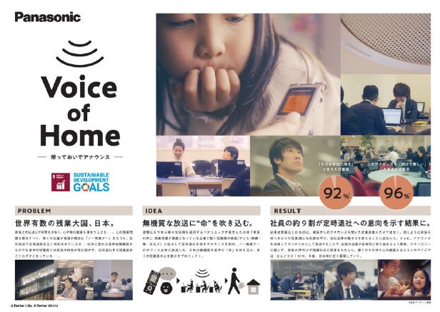株式会社大広(代表取締役社長:落合寛司、本社:東京都港区、以下 「大広」)株式会社大広WEDO(代表取締役社長執行役員:濱弘幸、本社:東京都港区、以下 「大広WEDO」)は、第59回JAA広告賞 消費者が選んだ広告コンクール ラジオ広告部門にて、当社が制作に携わった「パナソニック株式会社 Voice of Home 帰っておいでアナウンス(娘)篇」がグランプリを受賞いたしましたことをご報告いたします。企業の定時退社の取り組みを支援し、社会課題の解決につながるアイディアが評価され、受賞に至りました。