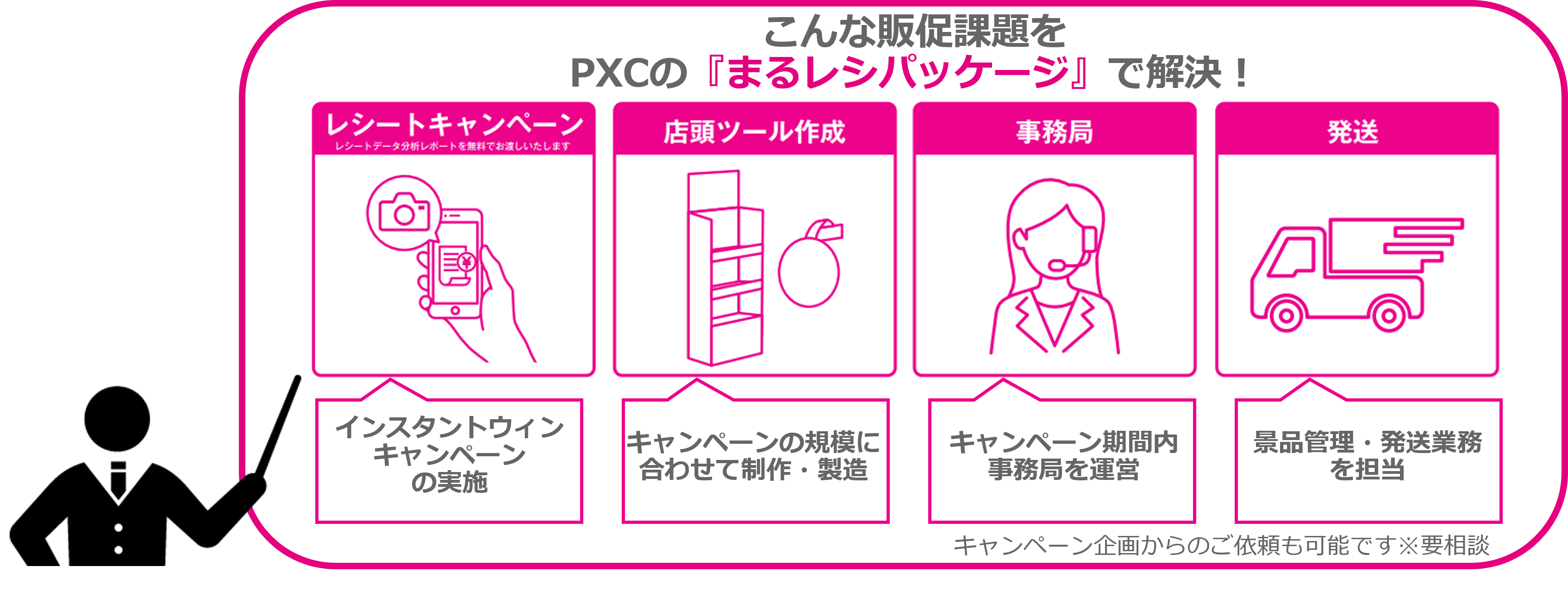 Pioneer of AI/SPを標榜し、セールスプロモーション業界のDXを牽引するPXC株式会社(本社:東京都台東区、代表取締役社長:菅野健一)は、株式会社ウィナス(本社:東京都豊島区、代表取締役社長:浜辺拓)と業務提携し、この度メーカー・流通・小売り業界の店頭販促ご担当者向けにデジタルキャンペーンと店頭販促をまるまるお任せできるサービス「まるレシ」の提供を開始します。