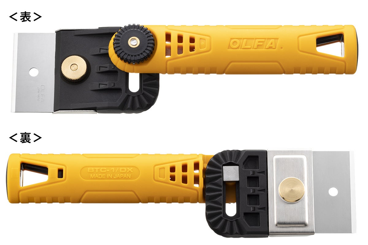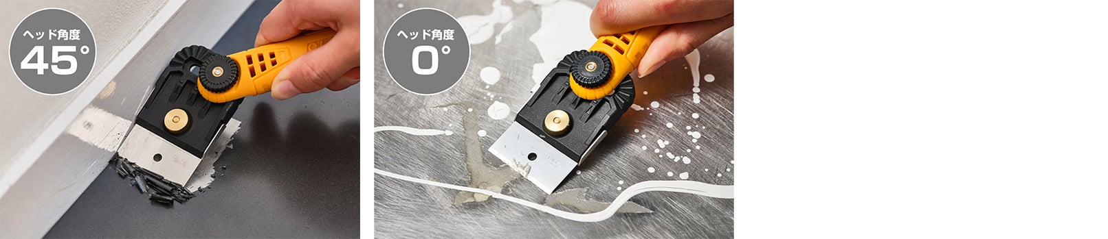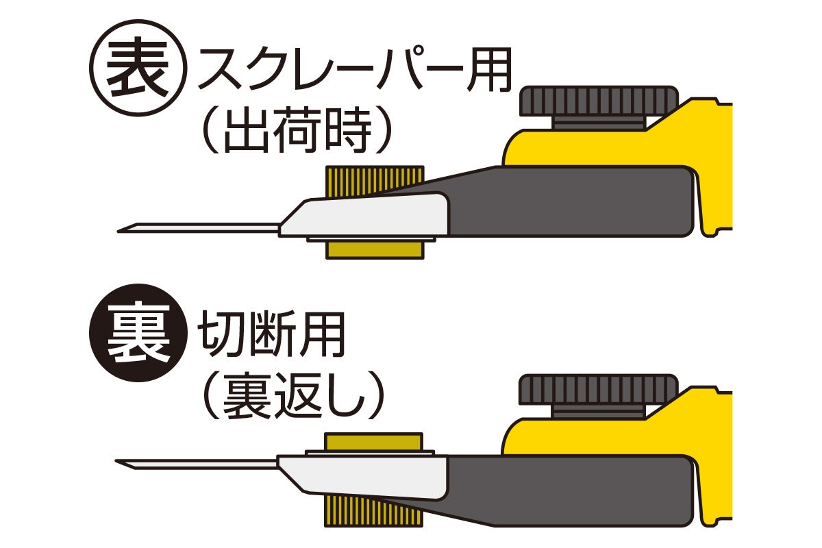 ヘッドを表向きに装着するとスクレーパーとして、裏向きに装着すると裁ちナイフとして使用できます。