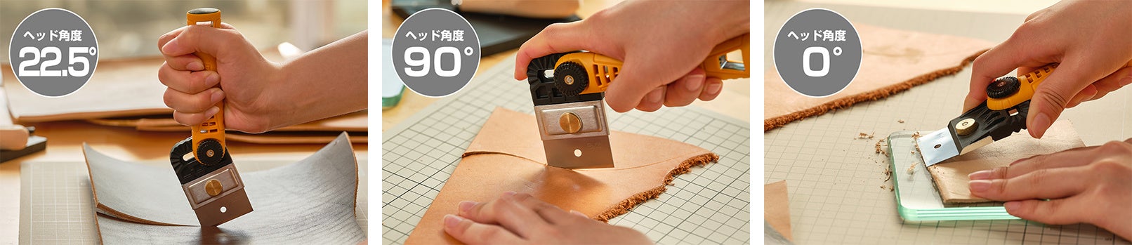 別たちプラスは、ヘッドの角度を変えることができ、スクレーパーとしても使える裁ちナイフです。1つで「切る・剥がす・削る」の3役をこなし、レザークラフトでの革裁ちや革漉き、さまざまな場面での剥がす・削る作業に活躍します。1983年発売の「別たち」の使いやすさに機能性をプラスした製品です。