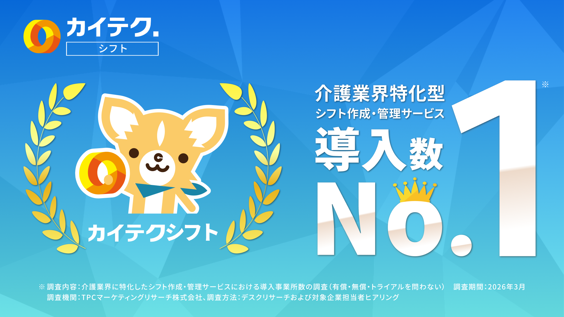 カイテク株式会社(本社:東京都新宿区、代表取締役社長:武藤 高史)は、このたび当社が提供する介護業界特化型シフト作成・管理サービス「カイテクシフト」が、導入数No.1※を獲得したことをお知らせいたします。