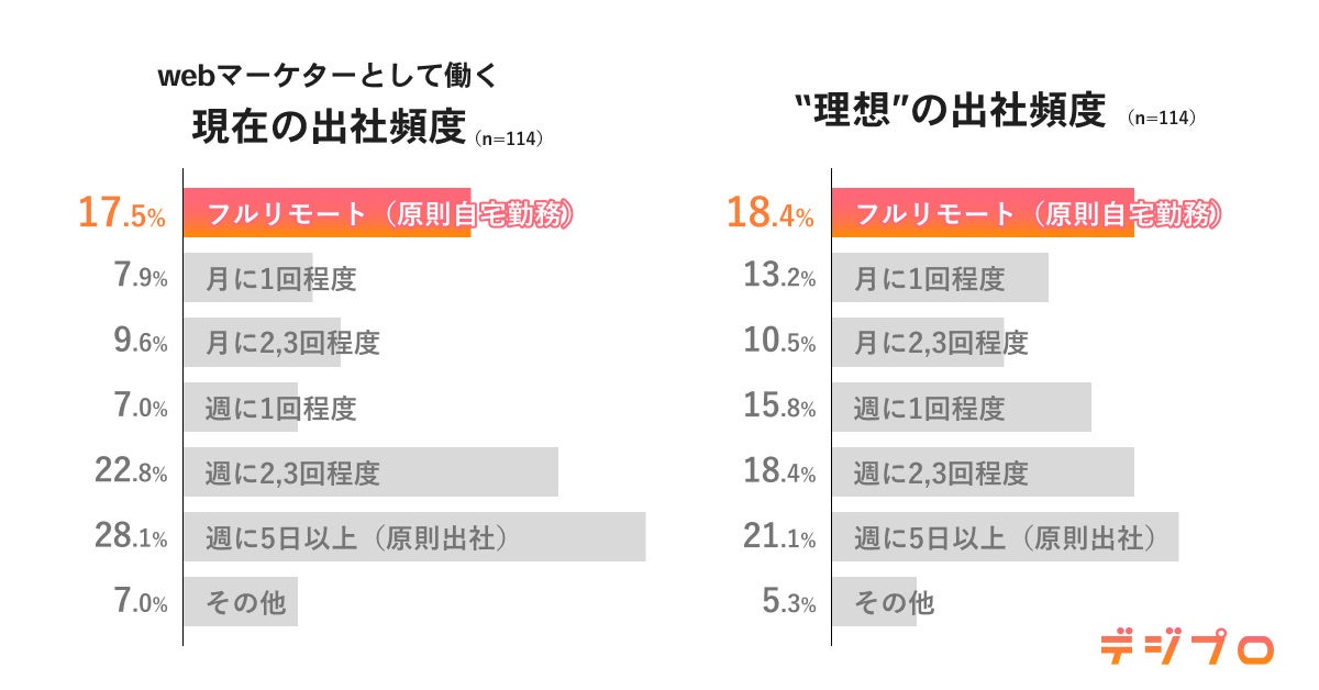 また、出社頻度についても調査したところ、「週に2,3回程度」が22.8%、「フルリモート(原則自宅勤務)」が17.5%と「原則出社」以外の回答が多く見られ、現在のWebマーケターは働き方に柔軟性があることが伺えます。また、理想の出社頻度も伺ったところ、「フルリモート(原則自宅勤務)」が18.4%いるなど希望する頻度については回答が分かれたものの、原則出社というこれまでの働き方に戻ることを希望しない方が多いこともわかりました。