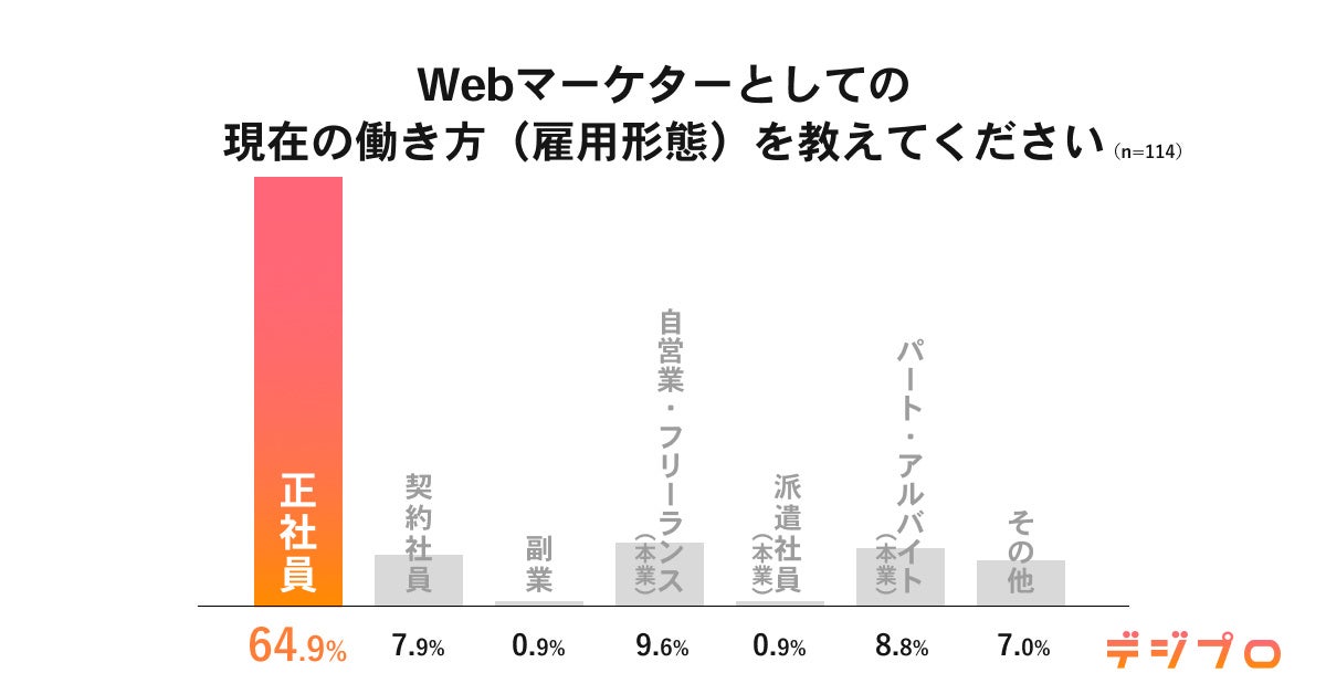 まずは「Webマーケターの働き方」について調査を行いました。現在の働き方(雇用形態)を尋ねたところ、