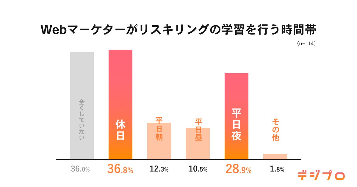 また、リスキリングの学習を行う時間帯を伺ったところ(複数回答可)、「休日(36.8%)」「平日夜(28.9%)」が特に多く、仕事が無い休日にまとめて、もしくは仕事が終わった後の夜の時間など、余暇の時間を学びの時間にあてていることがわかります。新しいサービスの誕生や変化が著しいWeb業界において、業務上のスキルアップや新たなスキル取得避けて通れず、それに向けて学びの時間をきちんと確保し取り組んでいる様子が調査によって明らかになりました。