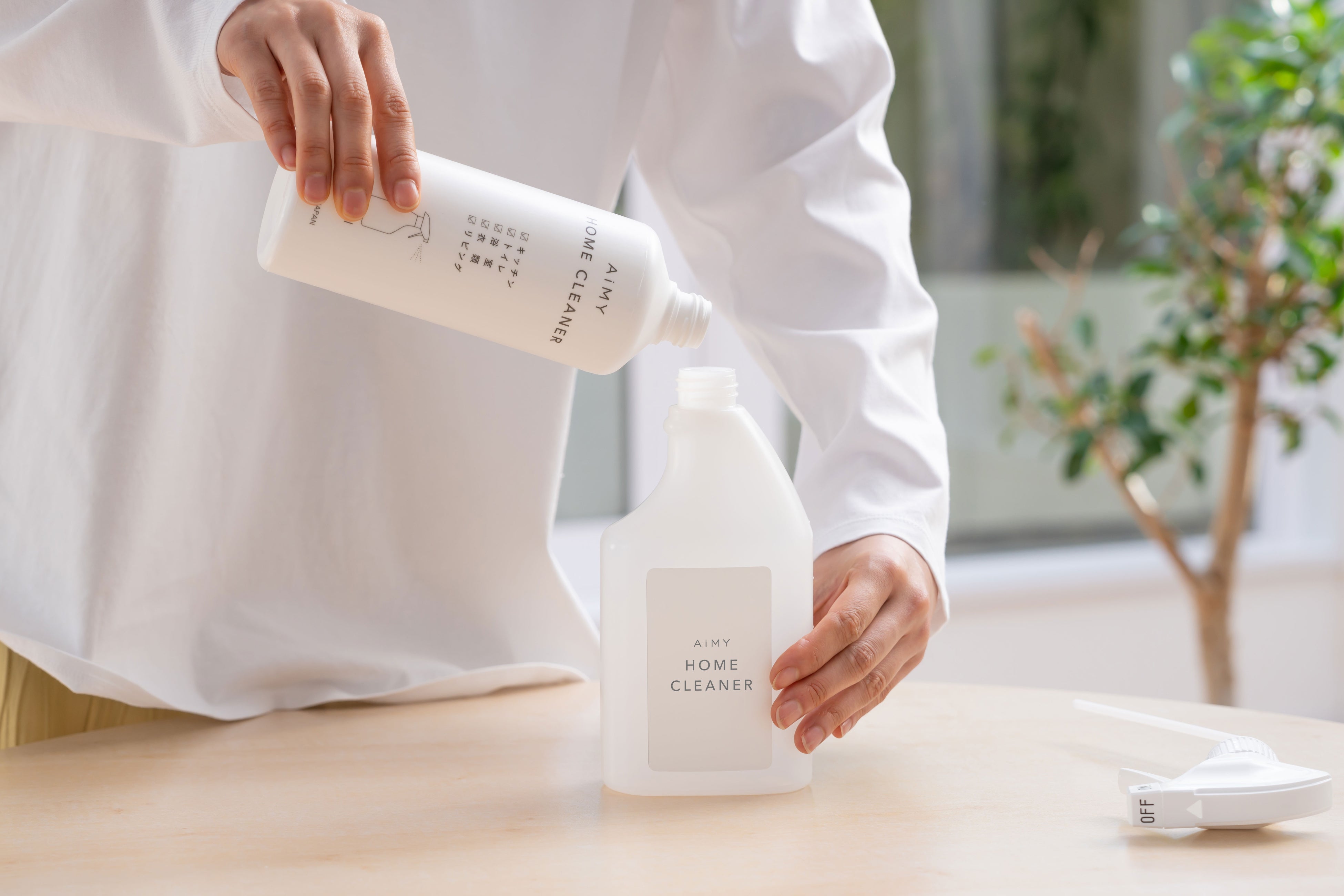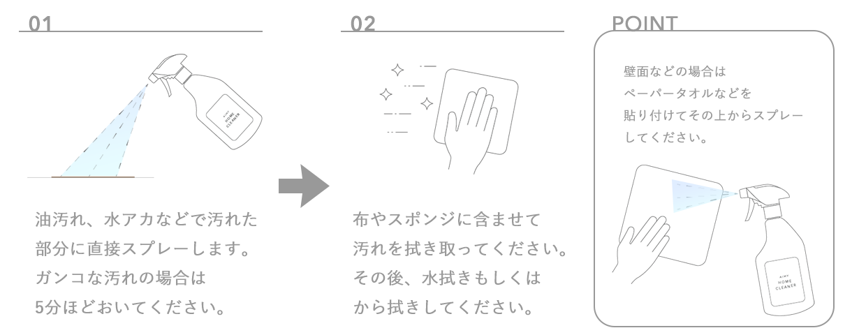 「エイミー ホームクリーナー」を必要な分だけ水で薄めて、付属のスプレーボトルでご使用ください。