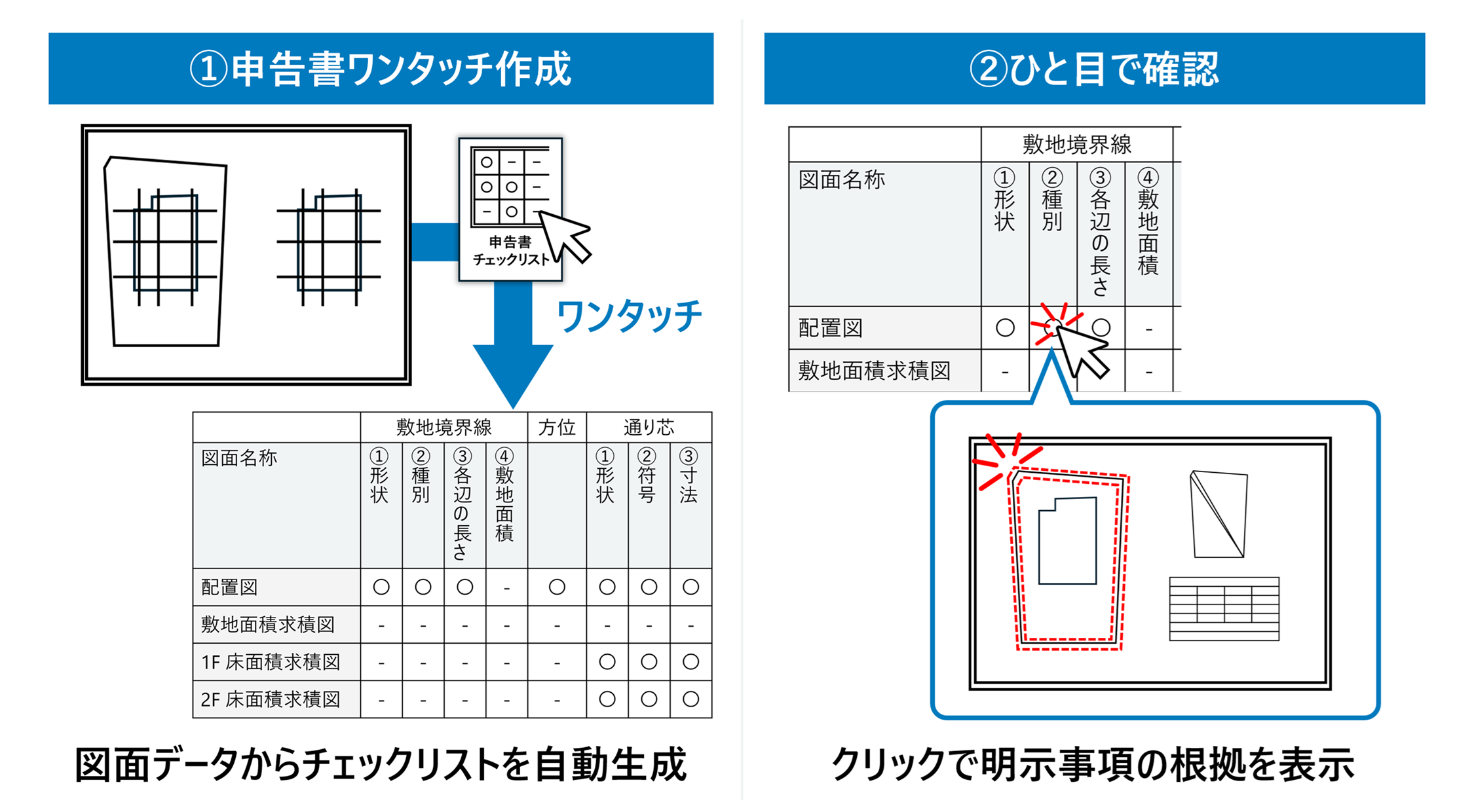 チェック項目をクリックするだけで、明示すべき事項の図示状況や根拠がひと目で確認できるため、入出力基準との整合性を確認する手間を大幅に削減し、記載漏れも未然に防ぎます。