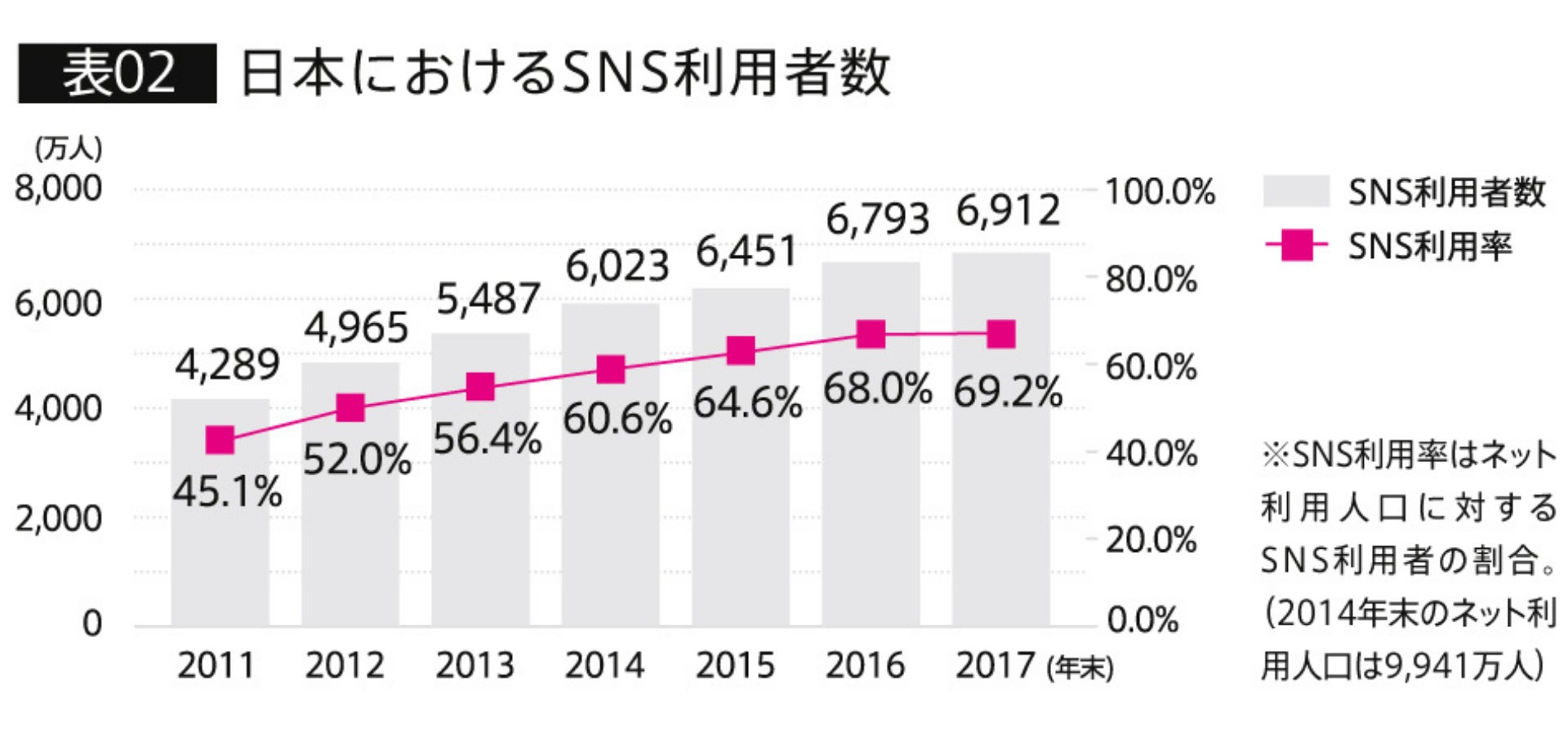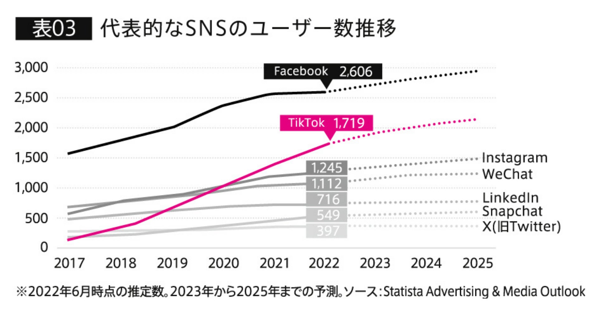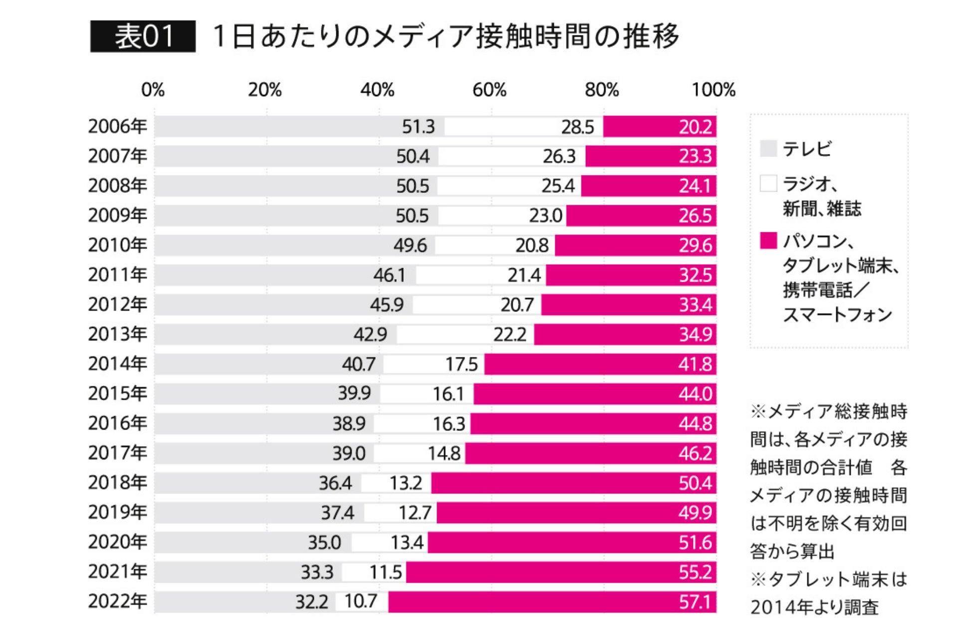 以前は音楽の流行をテレビをはじめとする「マスメディア」が作っており、音楽番組の数が現在より多く存在していました。多くのアーティストが音楽番組に出演し、それをきっかけにCDが売れていく時代でしたが、現在は音楽番組の数が減少しており、番組のスタイルもバラエティ要素が強くなっています。2006年~2022年のメディア接触時間の統計を見ると近年はパソコン、タブレット端末、携帯電話/スマートフォンの接触時間が増加しており、2022年にはテレビの視聴時間をパソコン、タブレット端末、携帯電話/スマートフォンが上回っています(表01)。この統計からも分かるようにマスメディアの中でも特にテレビの影響力が低下していると考えられます。一方で、スマートフォンの普及によりSNSが登場し、年々利用者が増えていきました(表02)。