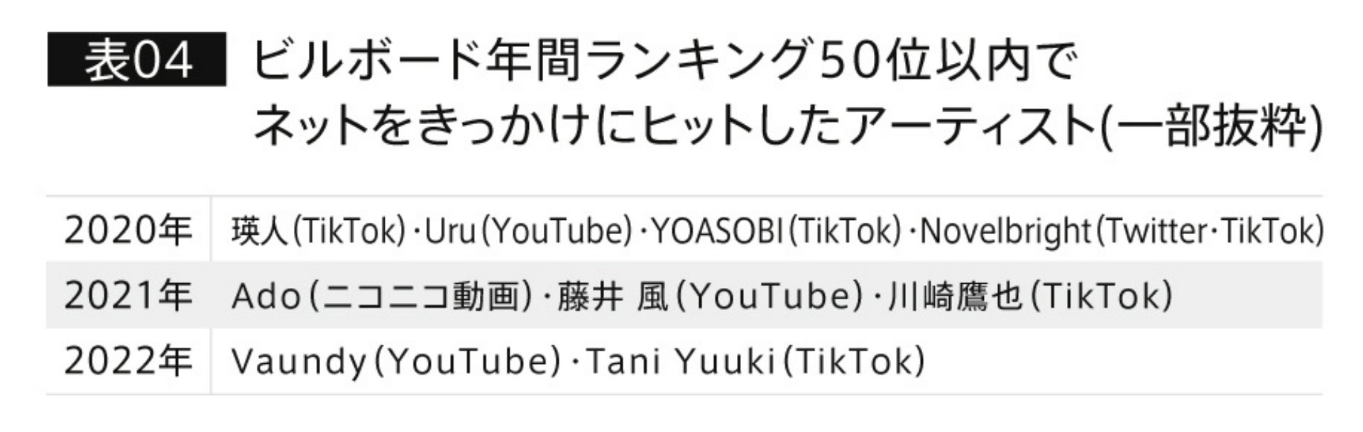 ※表04. ビルボード年間ランキング50位以内でネットをきっかけにヒットしたアーティスト(一部抜粋)