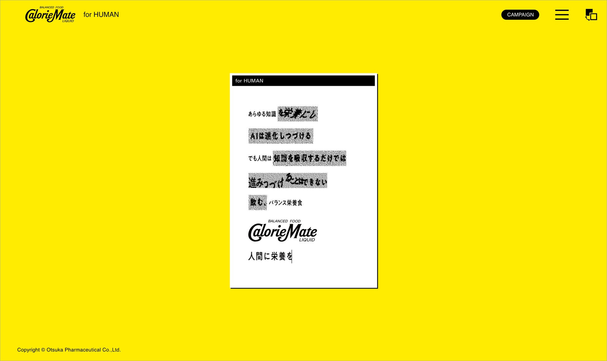 2020年の「CalorieMate to Programmer」、2021年の「CalorieMate TO TECHNOLOGY」に続き、第3弾となる今回のプロモーション「私はロボットではありません」。「人間に」必要な栄養素を手軽に補給できるカロリーメイト リキッドの特長や魅力を表現すべく、「人間とコンピュータの快適な関係」を研究する暦本純一さん監修のもと、人間だからこそ情報が読める特設サイトを開設。普段パソコンやスマートフォンを使う人であれば見覚えのある、ロボット認証をモチーフにしたサイトとなっております。テキスト認証モードや、画像認証モードなど、思わず読み解きたくなるようなコンテンツを是非お楽しみください。