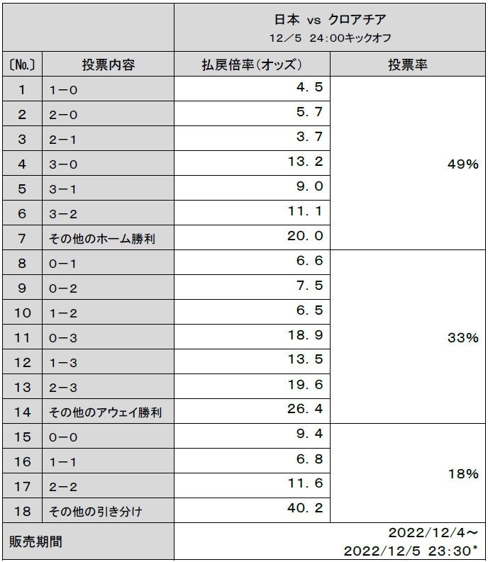 - 「WINNERサッカー1試合予想(日本 vs クロアチア)」の投票状況(12月5日(月)10時時点)