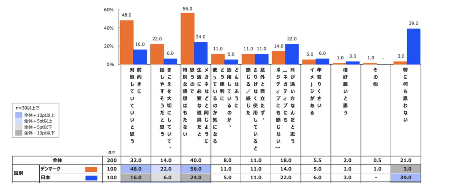 デンマークと日本の「きこえ」に対する意識比較調査 デンマークは約5割が補聴器使用者に対して好意的。補聴器は「会話を支える前向きなツール」