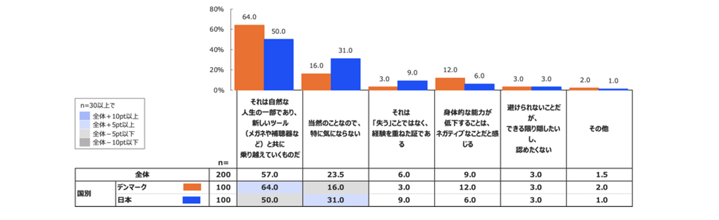 さらにデンマークでは、人が年齢を重ねていく中で、身体的な変化が起こることについて、「それは自然な人生の一部であり、新しいツール(メガネや補聴器など)と共に乗り越えていくものだ」と回答した人が64%にのぼりました。この身体的変化を「ツールで克服するもの」と捉える意識の高さが、聞こえづらさという問題を自覚した際に誰にも相談せず放置するケースが極めて少ないことに繋がっていると推測されます。一方、日本でも同様に「新しいツールと共に乗り越えていくものだ」と回答した人は50%いましたが、「当然のことなので、特に気にならない」と回答した人も31%と多く、問題解決のための行動(相談)を取る人が少ない可能性が見受けられました。日本人も正しい相談先を知り、気軽に相談できる雰囲気が醸成されれば行動につながる余白がまだ十分にあるとも言えます。