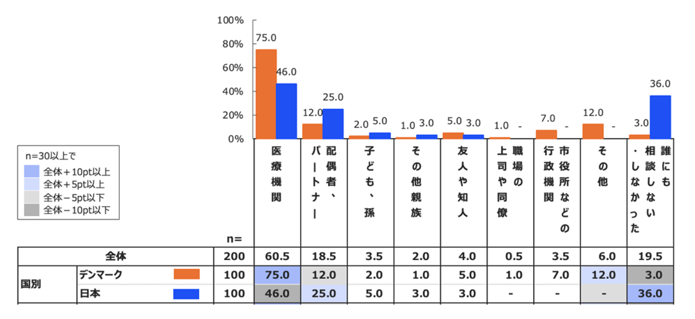 行動の鍵は、コミュニケーション重視の意識作り日本は「誰にも相談しない」が36人に対し、デンマークはわずか3人