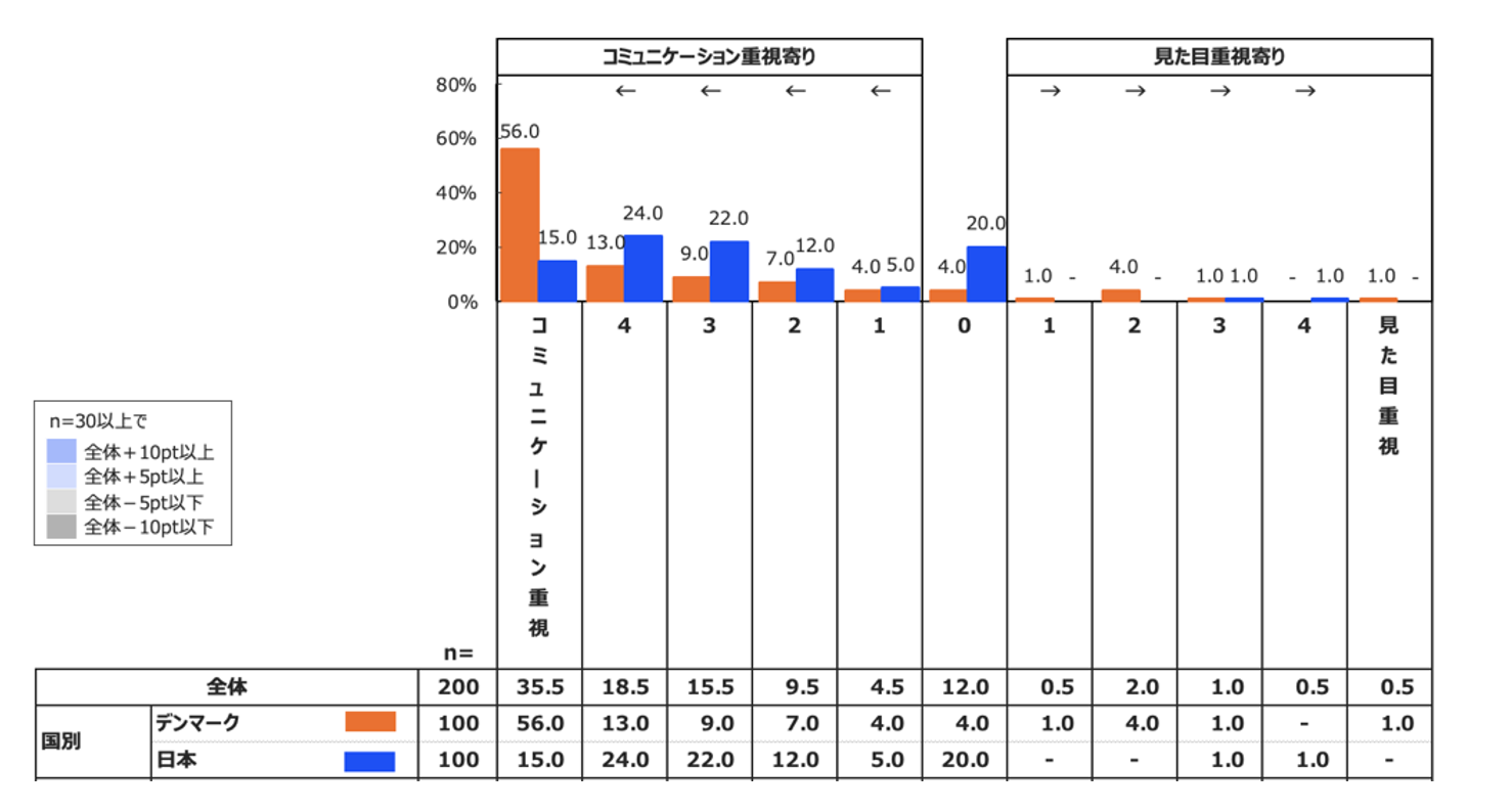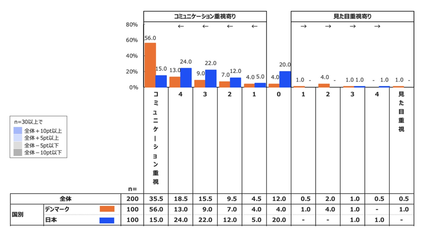 デンマークでは、56%が「コミュニケーション重視」(スコア5)を選択したことから、補聴器に対してはコミュニケーション機能を重視する傾向が強いことがわかります。一方、日本で「コミュニケーション重視」(スコア5)を選択したのは15%に留まりました。補聴器を検討することがコミュニケーションの改善に強く結びついている傾向が強いデンマークに対して、日本はコミュニケーションが最重要とは限らず、スケールも「5・4・3・2・1・0」と分散していることからも、人により意識にばらつきがあることが読み取れます。