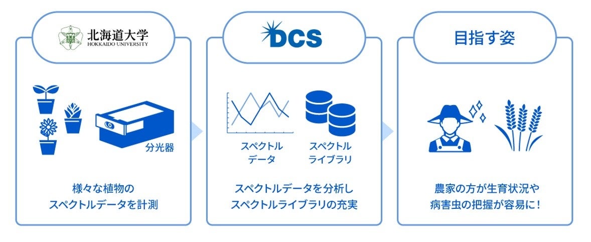 北海道大学の農業におけるスペクトル計測の専門知識や研究ノウハウと、DCSのデータ解析の強みを組み合わせることで、「スペクトルライブラリ」の充実を図ると共に、それを活かした多様な植物の生育状況や病害虫被害の把握のための実装を容易にし、国内の農業の様々な課題の解決を目指します。