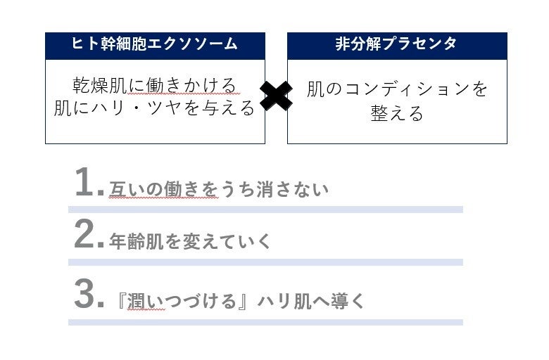⻑期間で肌を働きかける*¹「⾮分解プラセンタ*²」、短期間で効果を体感できる「ヒト脂肪間質細胞エクソソーム*³」の 組み合わせが互いの効果を⾼め合い ゆらぎのない肌へと導きます。