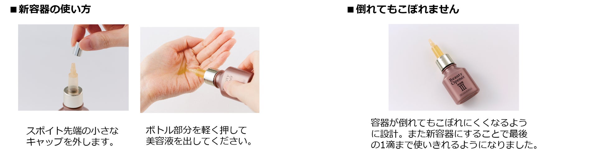 5年連続国内売上№1 ※3を誇るビューティーオープナーが、この度お客様のご要望にお応えして、より「使いやすい容器」に生まれ変わります。先端の小さなキャップを外してプッシュして使用するオリジナルの形状にリニューアルし、倒れてもこぼれず最後の一滴まで使える容器へとパワーアップいたしました。