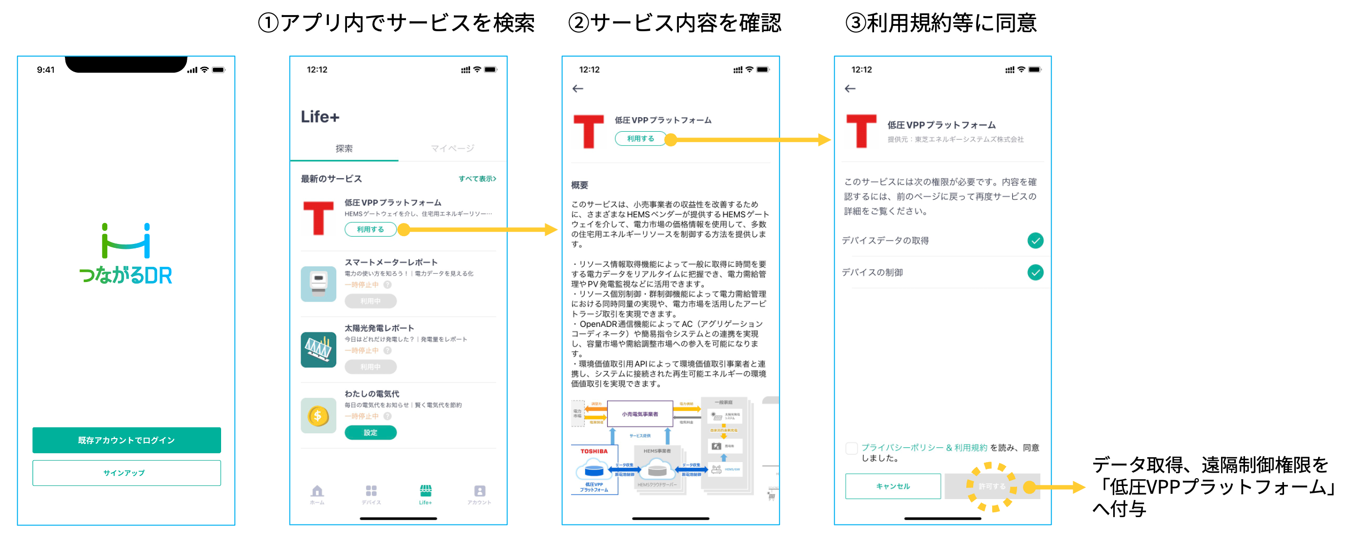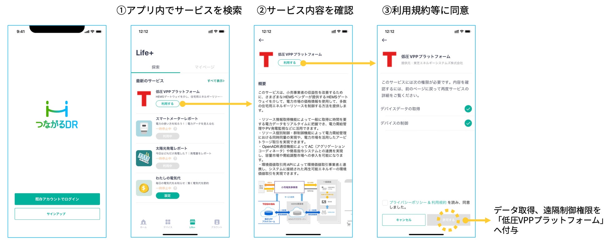 低圧VPPプラットフォームを利用するお客様※はモバイルアプリ「つながるDR」から、スマートメーター、蓄電池等の接続設定をした後、同様にモバイルアプリ内操作で低圧VPPプラットフォームに対する利用許諾を行なうだけでサービス連携が完了します。