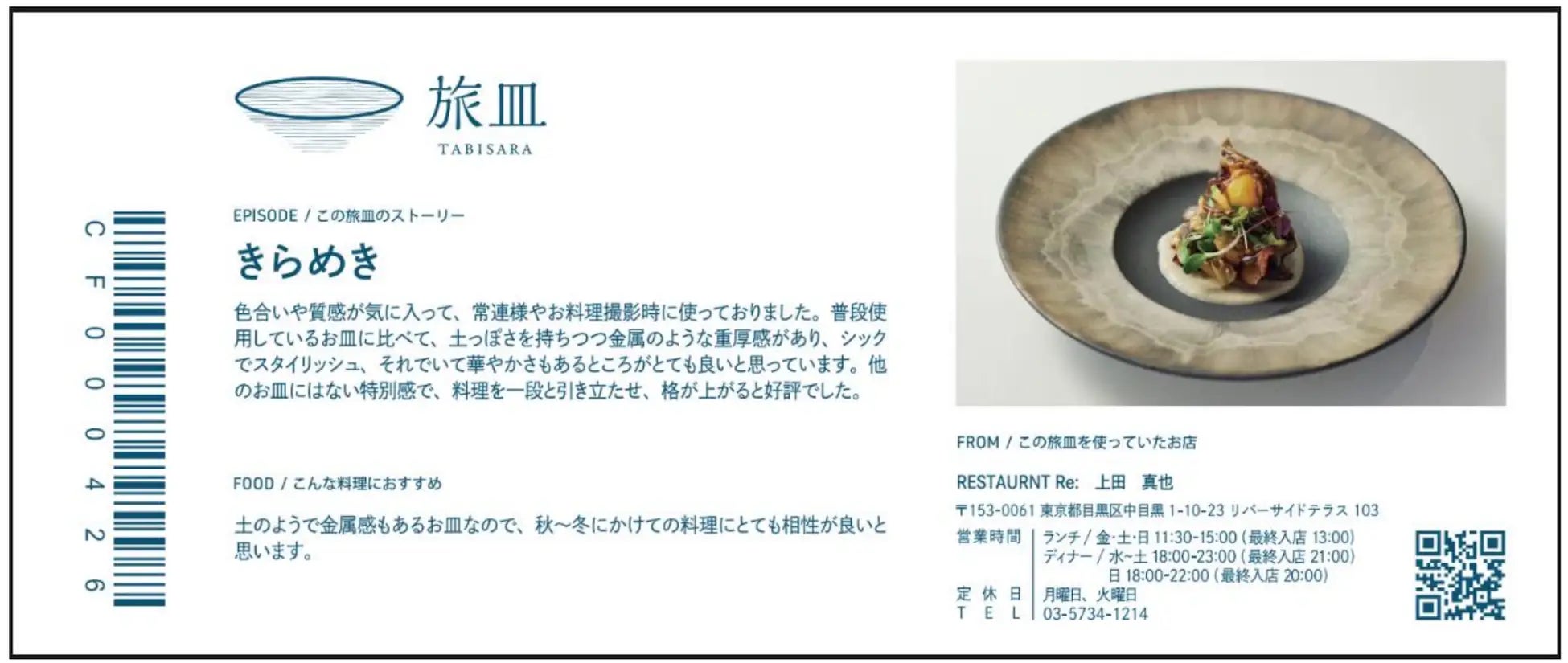 「旅皿」は、この捨てられるはずだった器を再流通させ、一流の料理人が選び、愛用した経緯を「旅」に見立て、そのストーリーを付加価値として伝えることで、器の価値を高めて販売しています。
