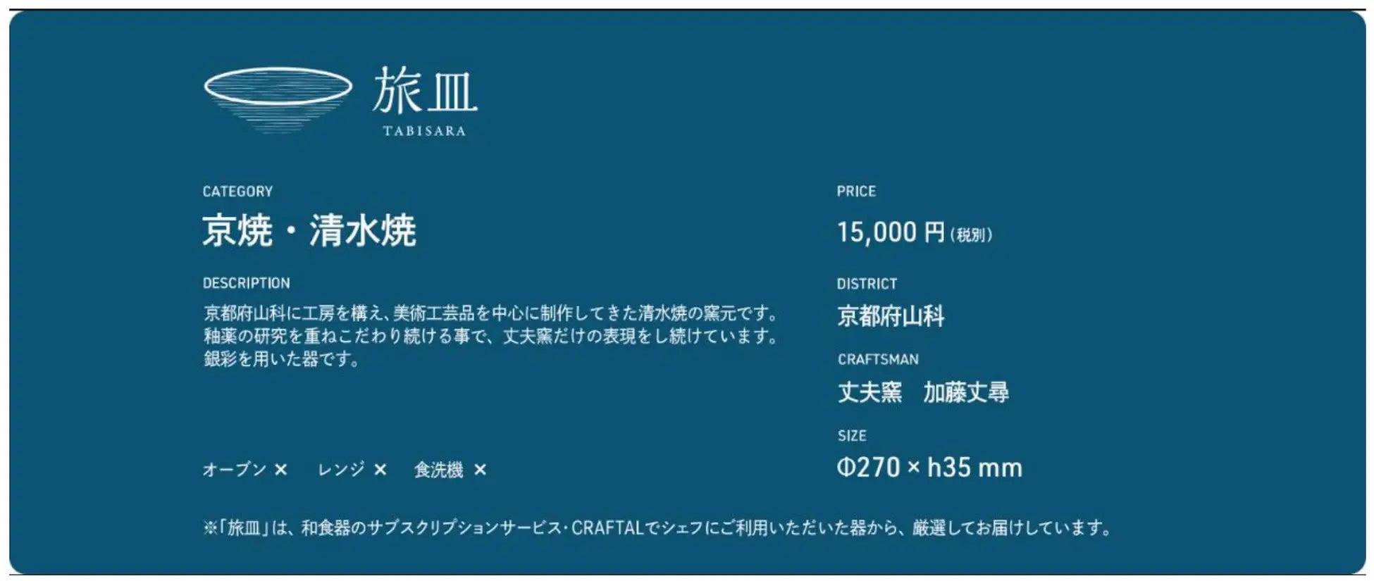 取り扱う器は、主に京焼・清水焼や九谷焼など伝統工芸のつくり手が生み出した和食器で、株式会社Culture Generation Japanが運営する飲食店向け和食器のサブスクリプションサービス「CRAFTAL」で使用した“日本全国の窯元や陶芸作家の上質な作品”です。