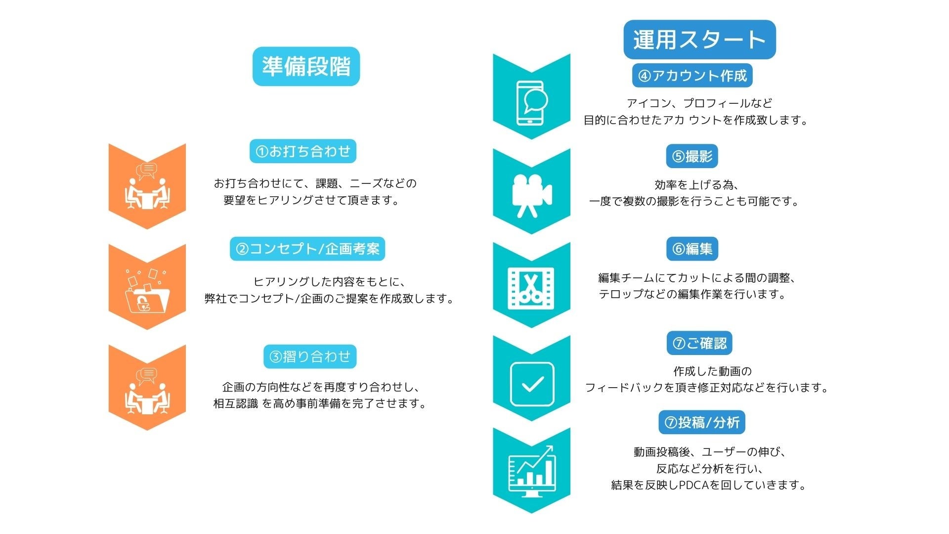 運用開始まで、しっかりとヒアリング、摺り合わせをさせていただいてからアカウント開設、撮影、編集、投稿、分析まで全てお任せください。