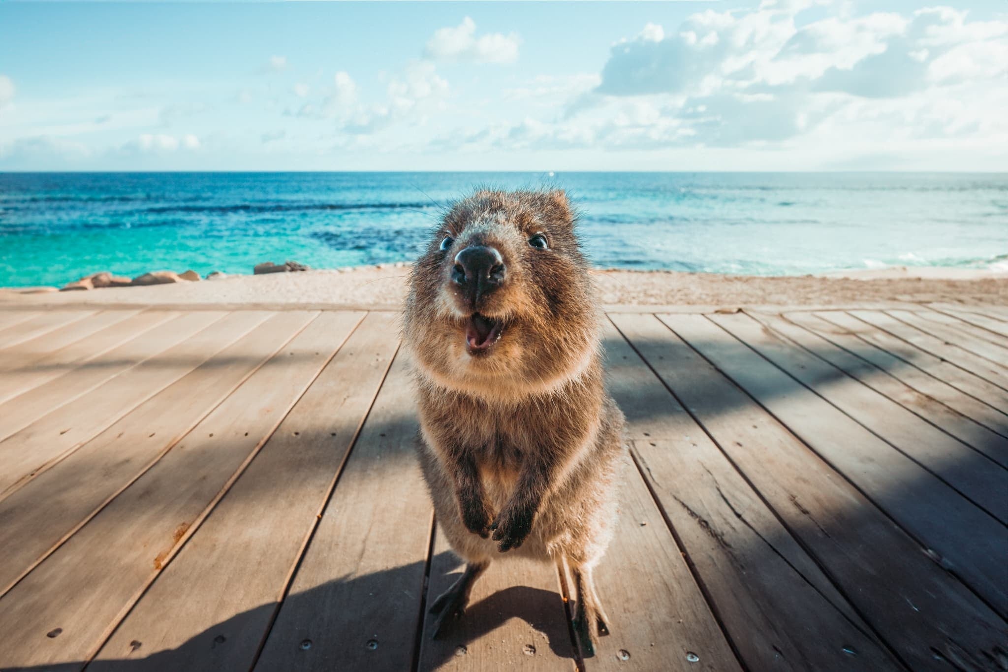口元が微笑んでいるように見えることから“世界一幸せな動物”と称される有袋類「クオッカ」の世界最大の生息地です。約12,000匹が生息し、島のいたるところで出会えます。島の名前は、17世紀のオランダ人探検家が「クオッカ」を大きなネズミと勘違いしたことから、オランダ語で「ネズミの巣」を意味する「ロットネスト」と名付けられました。