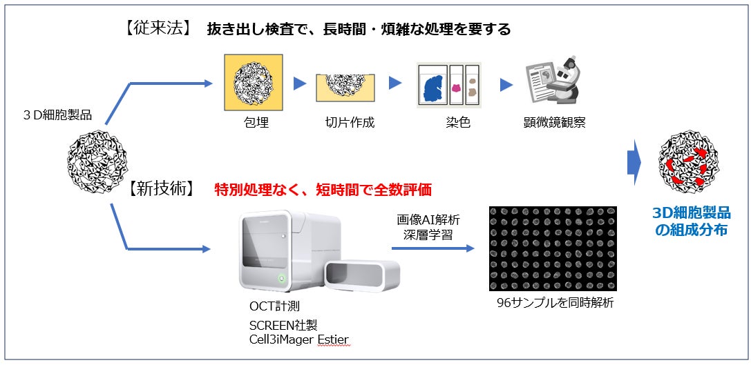従来は細胞組織の内部状態の評価には、煩雑な試料処理が必要でしたが、OCT技術とAI/深層学習を用いた新しい評価技術によって、特別な処理なく、短時間での全数評価が実現しました。(上:従来法、下:新技術)