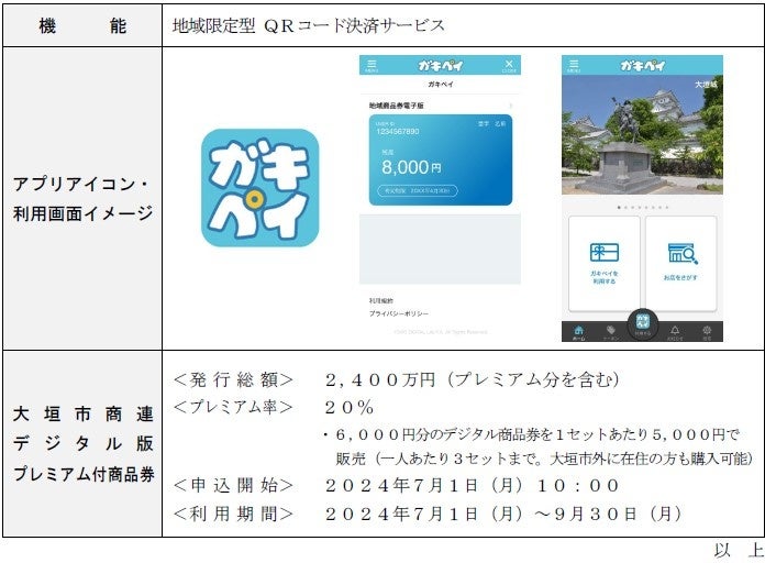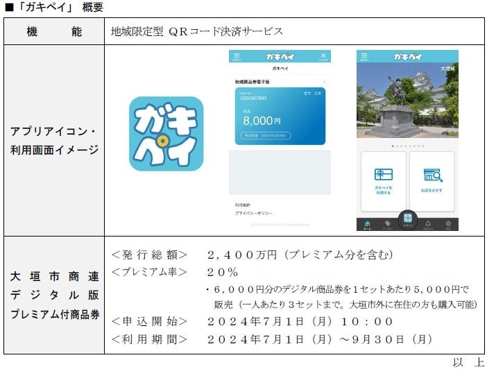 また、「ガキペイ」を活用した事業の第一弾として、7月1日(月)からは「ガキペイ」で「大垣市商連デジタル版プレミアム付商品券」が発行されます。プレミアム付商品券の購入は、同日から先着順で受付し、市内対象店舗においてQRコード決済での利用が可能となります。