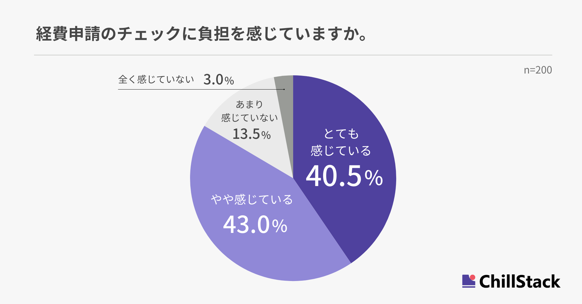 経費申請のチェックに負担を感じているか尋ねたところ、「とても感じている」と「やや感じている」が合わせて83.5%で、8割以上が負担を感じていることがわかりました(n=200)。
