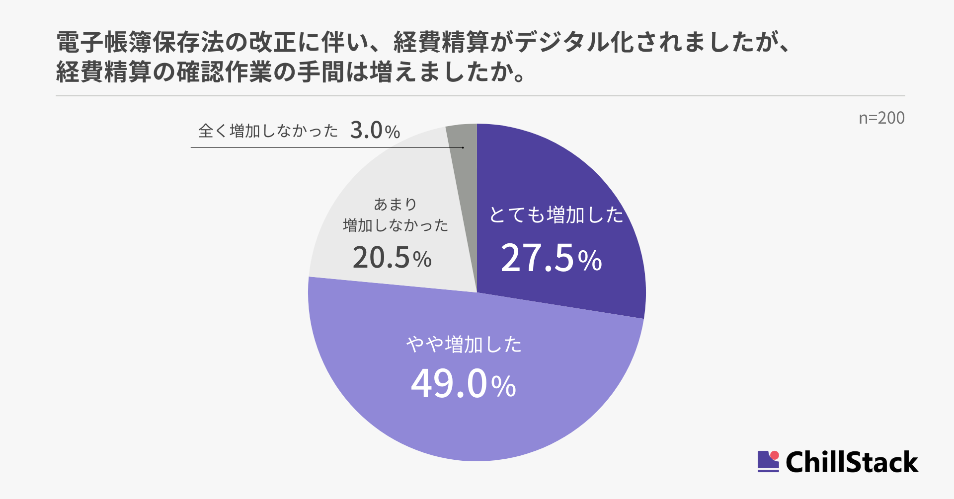 電子帳簿保存法の改正で経費精算がデジタル化されたことに対し、経費精算の確認作業の手間は増えたか尋ねたところ、「とても増加した」と「やや増加した」が合わせて76.5%で、約8割の現場で手間が増えたことがわかりました(n=200)。