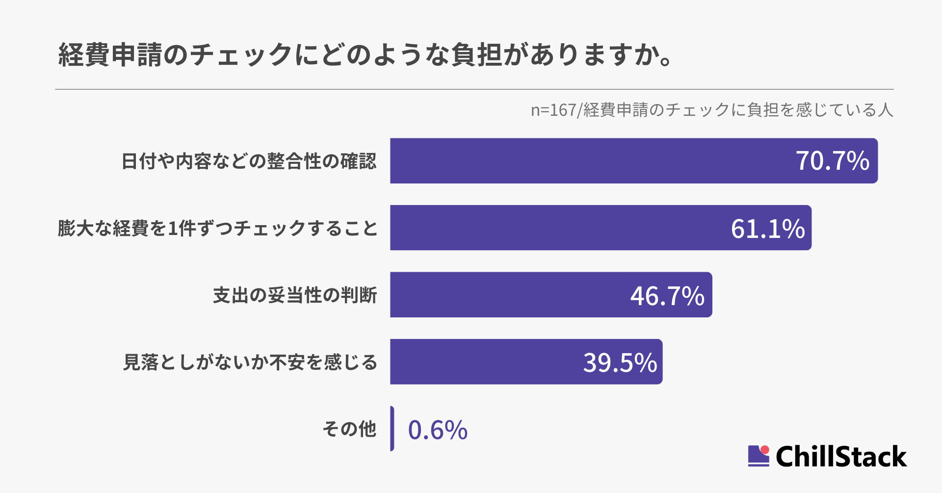経費申請のチェックにどのような負担があるか尋ねたところ、「日付や内容などの整合性の確認」が70.7%で最も多く、「膨大な経費を1件ずつチェックすること」が61.1%、「支出の妥当性の判断」が46.7%と続きました(n=167/経費申請のチェックに負担を感じている人)。