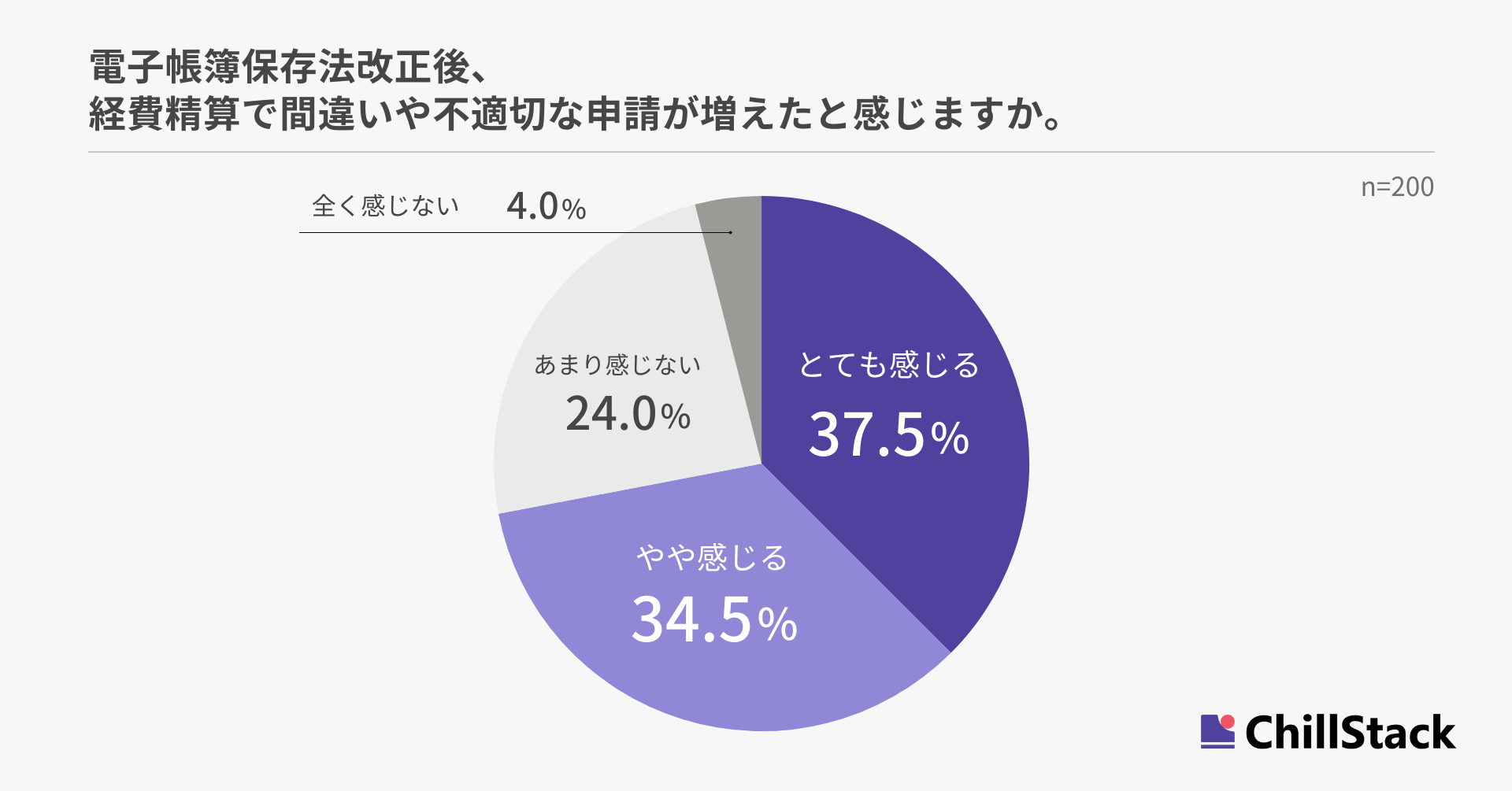 電子帳簿保存法改正後、経費精算で間違いや不適切な申請が増えたと感じるか尋ねたところ、「とても感じる」と「やや感じる」が合わせて72.0%で、7割以上が間違いや不適切な申請が増えたと感じていることがわかりました(n=200)。