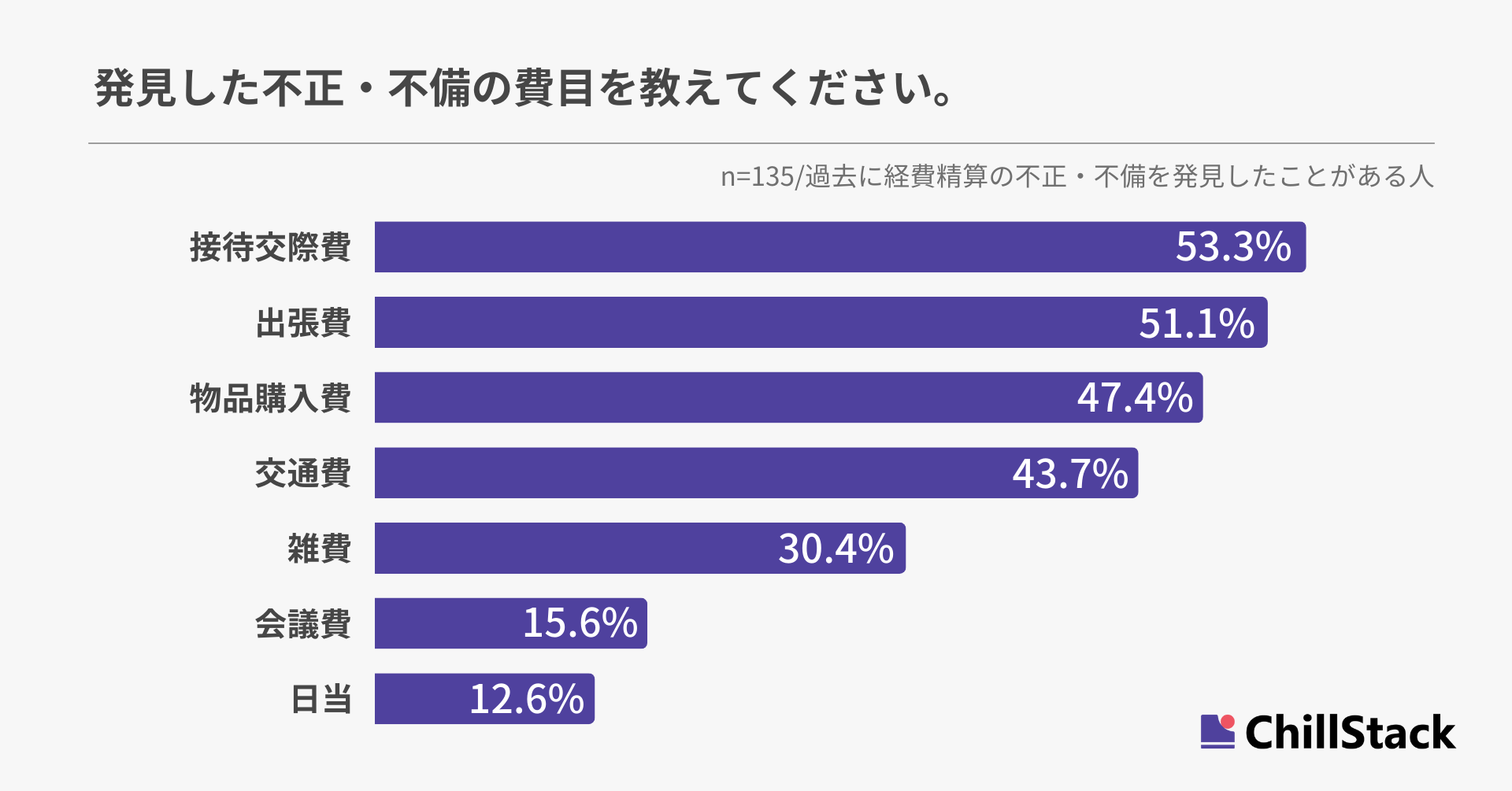 発見した不正・不備の費目について尋ねたところ、「接待交際費」が53.3%で最も多く、「出張費」が51.1%、「物品購入費」が47.4%と続きました(n=135/経費精算の不正・不備を発見したことがある人)。