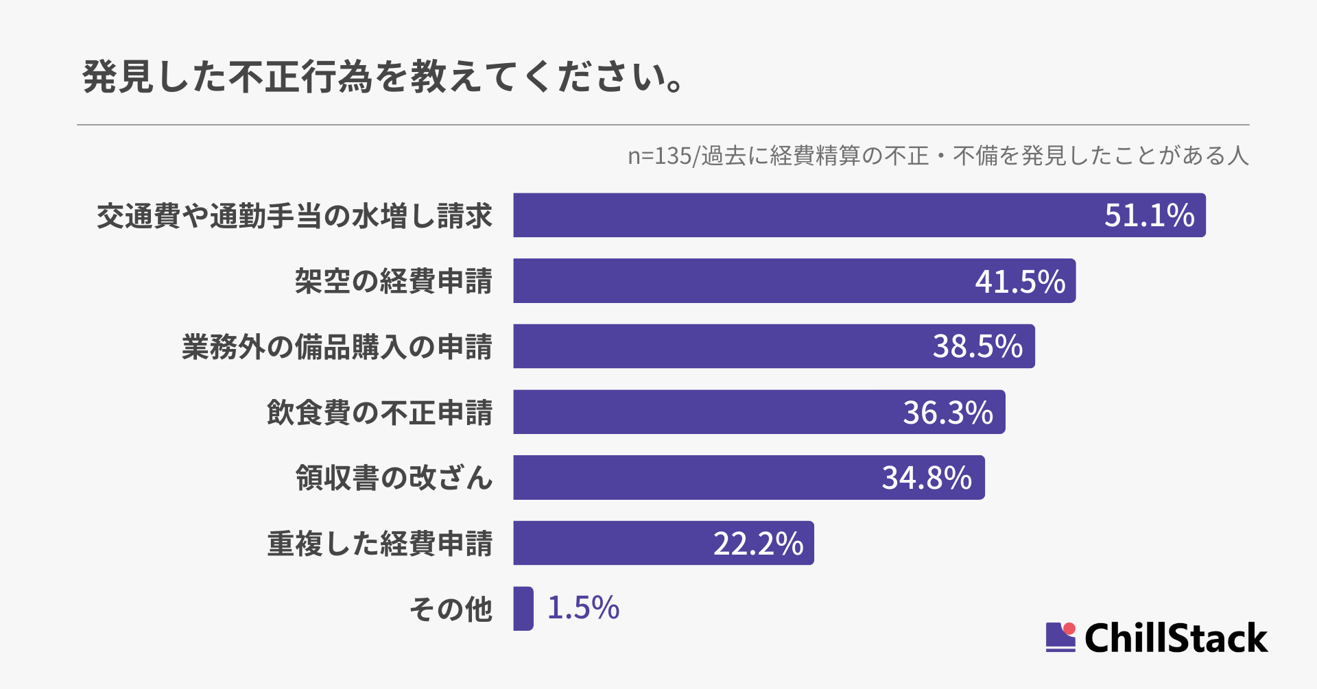 発見した不正行為について尋ねたところ、「交通費や通勤手当の水増し請求」が51.1%で最も多く、「架空の経費申請」が41.5%、「業務外の備品購入の申請」が38.5%と続きました(n=135/経費精算の不正・不備を発見したことがある人)。