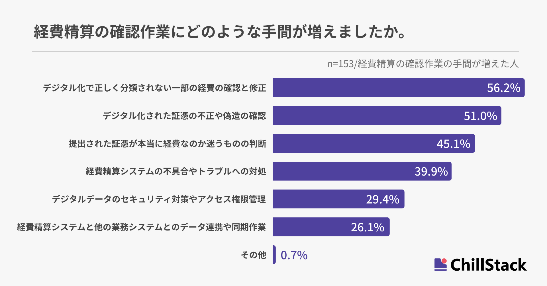 どのような手間が増えたか尋ねたところ、「デジタル化で正しく分類されない一部の経費の確認と修正」が56.2%で最も多く、「デジタル化された証憑の不正や偽造の確認」が51.0%、「提出された証憑が本当に経費なのか迷うものの判断」が45.1%と続きました(n=153/経費精算の確認作業の手間が増えた人)。