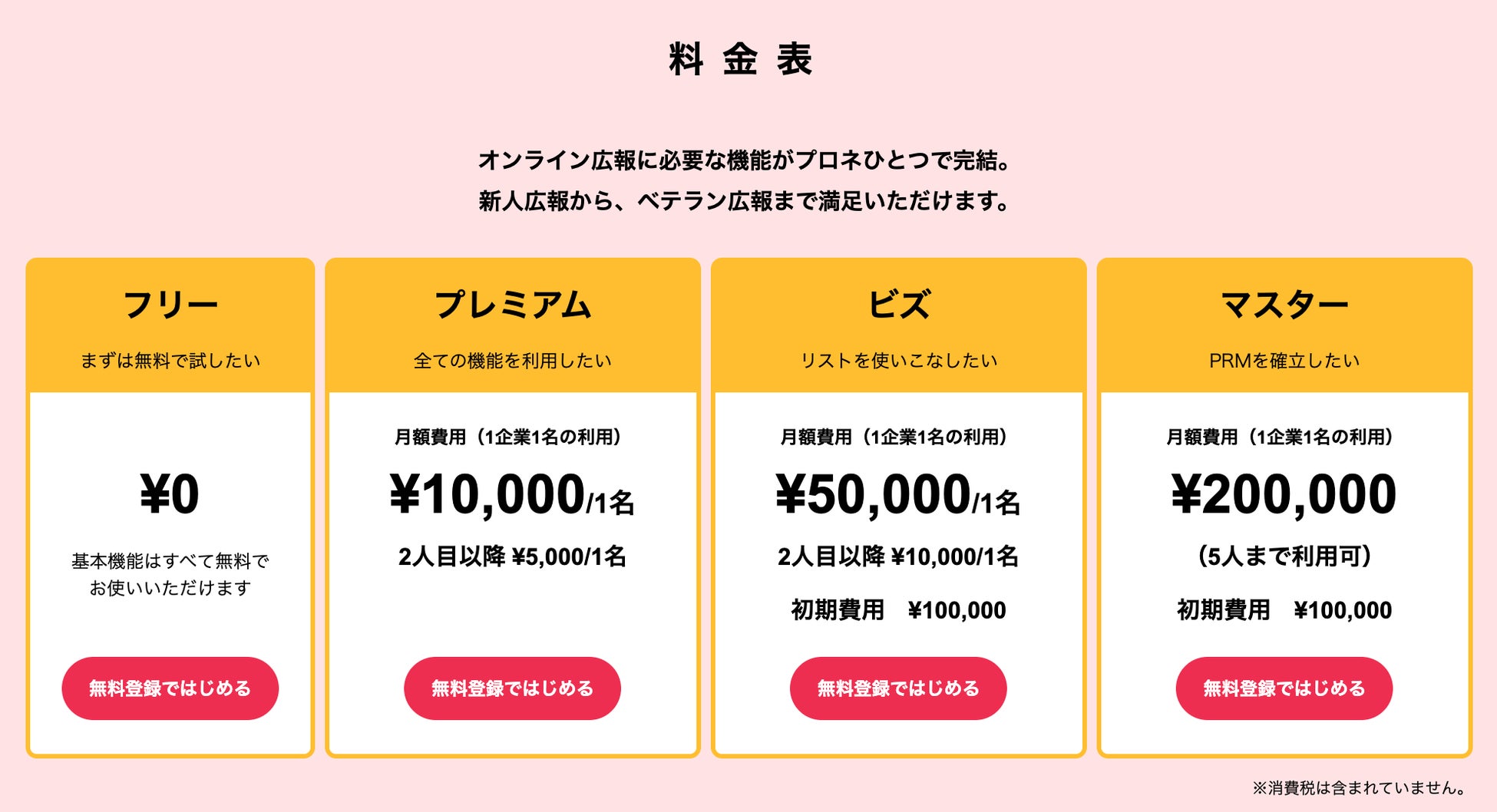 無料のフリープランと、オンライン広報に必要なフル機能が使える月額1万円(税別)のプレミアムプランがあります。2人目以降は1人につき5千円(税別)/月の料金が追加されます。