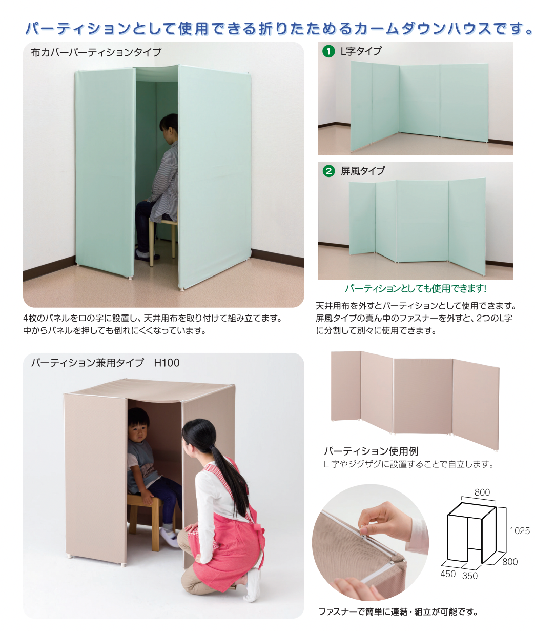 このカームダウンハウスは折り畳んでコンパクトに収納できたり、運ぶことができます。移動は1人で運べます。保育園や幼稚園、小学校、福祉施設や病院などにおすすめしたいカームダウンスペースです。