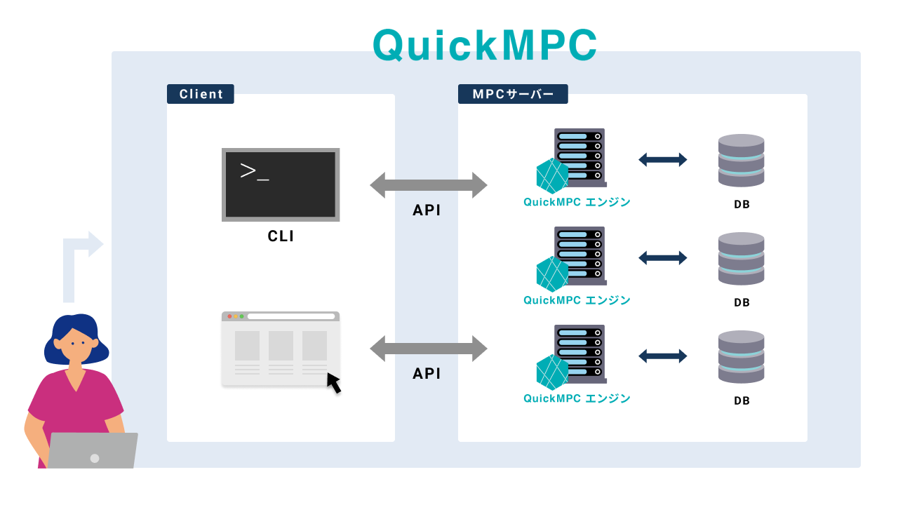 QuickMPCは、Acompanyが2020年10月に公開したSMPCエンジンです。このエンジンでは機密データやプライバシーデータを秘匿化しつつ、事前定義されている基本統計量計算や、ロジスティック回帰分析、重回帰分析といった軽量な機械学習を実行することができるようになります。 開発者は、QuickMPCエンジンと2種類のクライアントライブラリを利用することで、SMPC機能を使ったSaaSプロダクトを簡単に開発できるようになります。クライアントライブラリはPythonとJavaScript(TypeScript)で提供されており、QuickMPCエンジンとAPIを通じてやりとりができるようになっています。 QuickMPCをOSSとして提供することで、個人の権利を侵害することなく、ビジネス的なインサイトを獲得したい企業を手助けします。