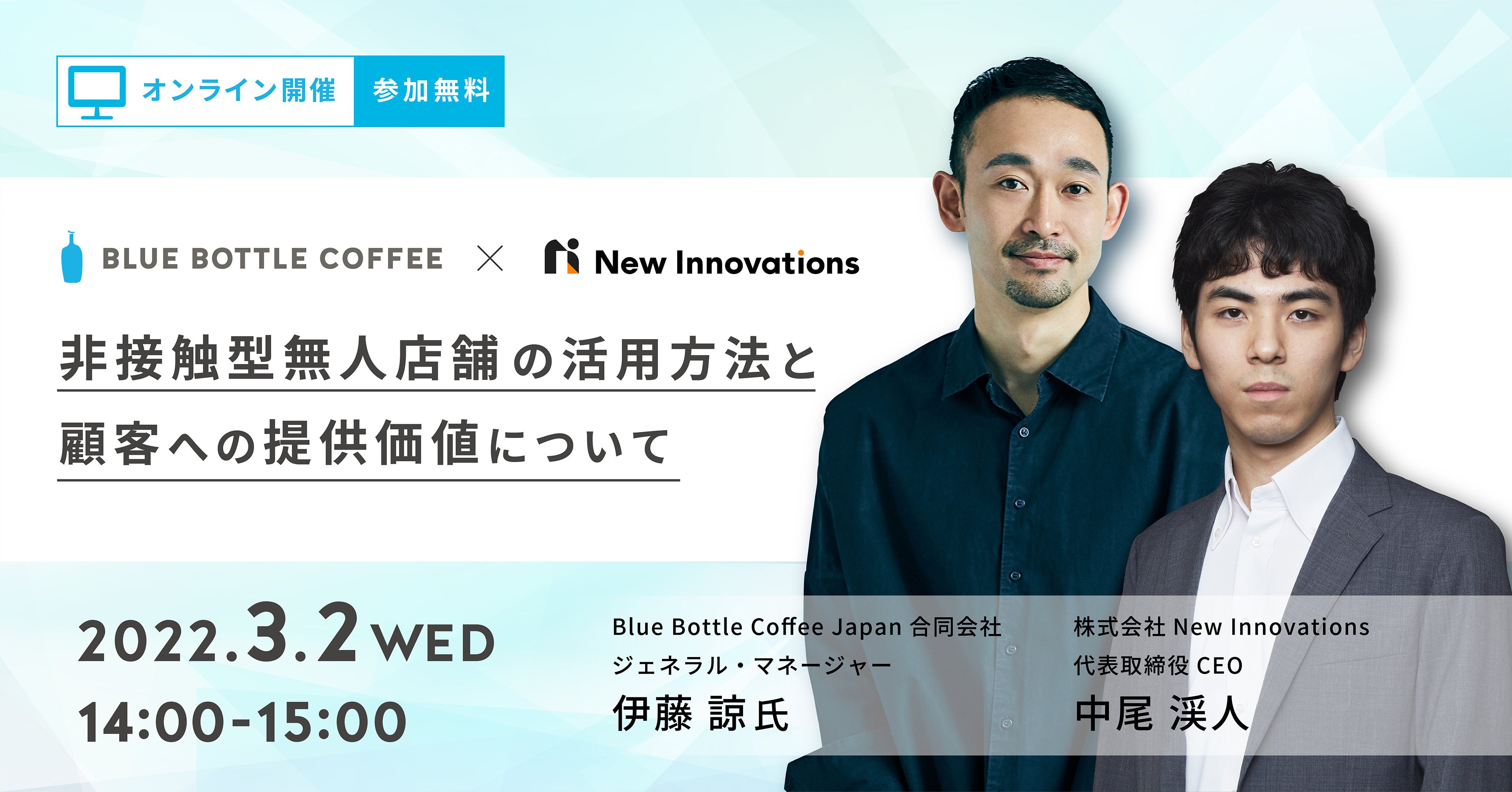 【無料セミナー】Blue Bottle Coffee Japan代表 伊藤諒氏登壇!New Innovations CEO 中尾と語る、非接触型無人店舗の活用方法と顧客への提供価値について