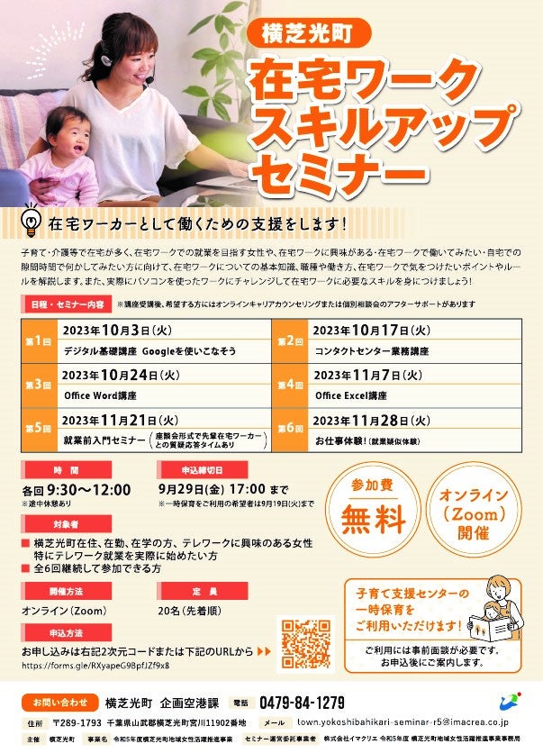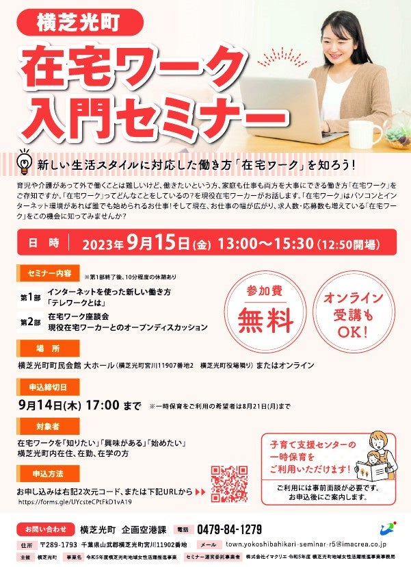 本事業の一環として、町内在住、在勤、在学の女性を主な対象者とした「在宅ワーク入門セミナー」を2023年9月15日(金)、横芝光町町民会館大ホールとオンラインにてハイブリッド開催します。