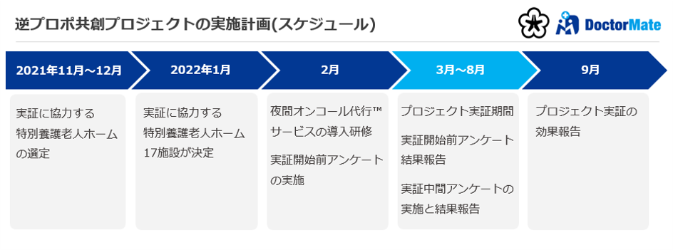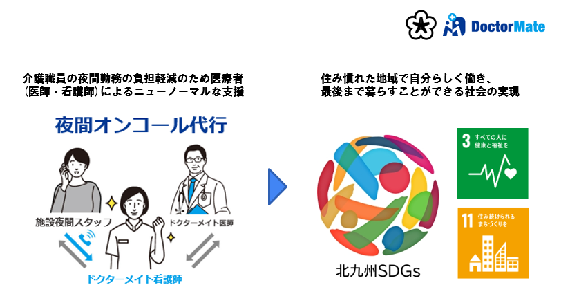 そこで逆プロポ共創プロジェクトでは、内閣府の国家戦略特区事業に認定されており、医療・保健・福祉施策の豊富な実績、高い技術力を持つ企業・学術研究機関との連携体制がある北九州市と、全国500を超える介護施設向けに「オンライン医療サービス」と「夜間オンコール代行サービス」を提供するドクターメイトで、介護施設に入居する方の安心安全の確保と同時に、介護施設職員の夜間帯の負担軽減をしながら、必要な医療サービスを持続的に提供できるニューノーマルな地域連携システムの実現と、高齢成熟社会において誰一人取り残さない持続可能性が高い、社会の実現を目指します。