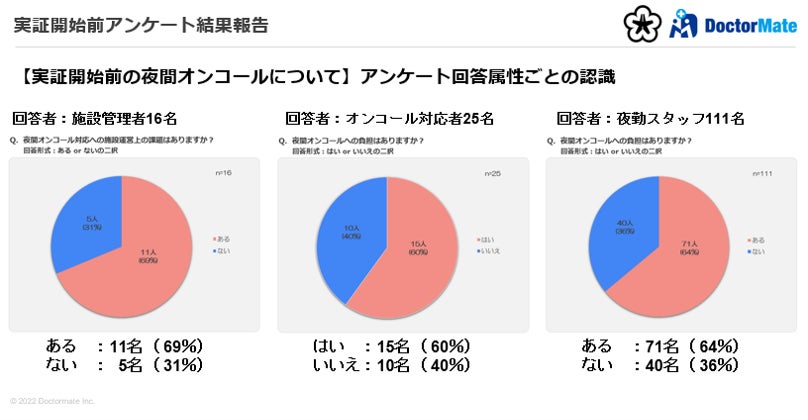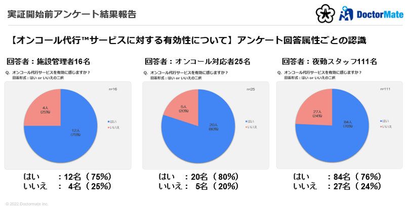 介護施設向けに医療相談・夜間オンコール代行™を提供するドクターメイト株式会社(本社:東京都中央区、代表取締役医師:青柳直樹、以下「ドクターメイト」)は、逆プロポ共創プロジェクトに協力する北九州市内の特別養護老人ホーム17施設の施設職員に対して、実証開始前に夜間帯負担感についてなどを確認するアンケート調査を実施しました。本リリースではアンケート調査結果をご報告いたします。