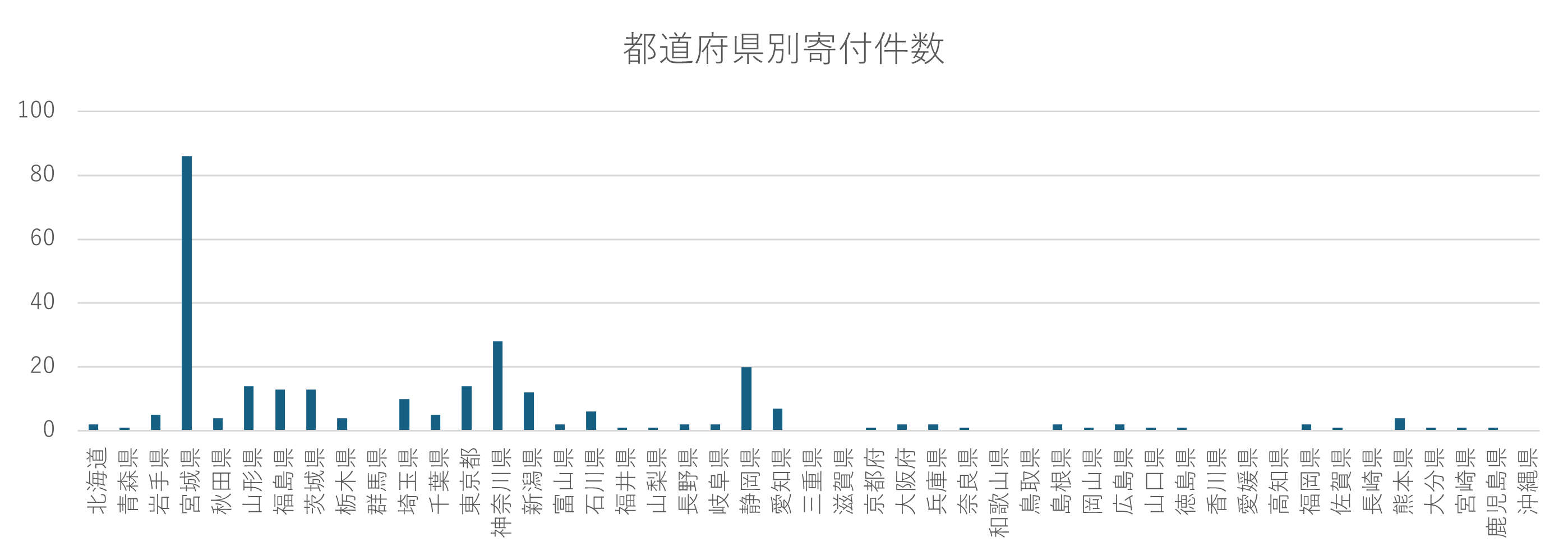 37都道府県の方からお車のご寄付をいただきました。長く活動をしている宮城県からの寄付が一番多い結果となりました。今回の取り組みで初めて寄付をいただいた都道府県もあったため、今後も廃車で社会貢献ができることを知っていただけるよう、周知を続けてまいります。